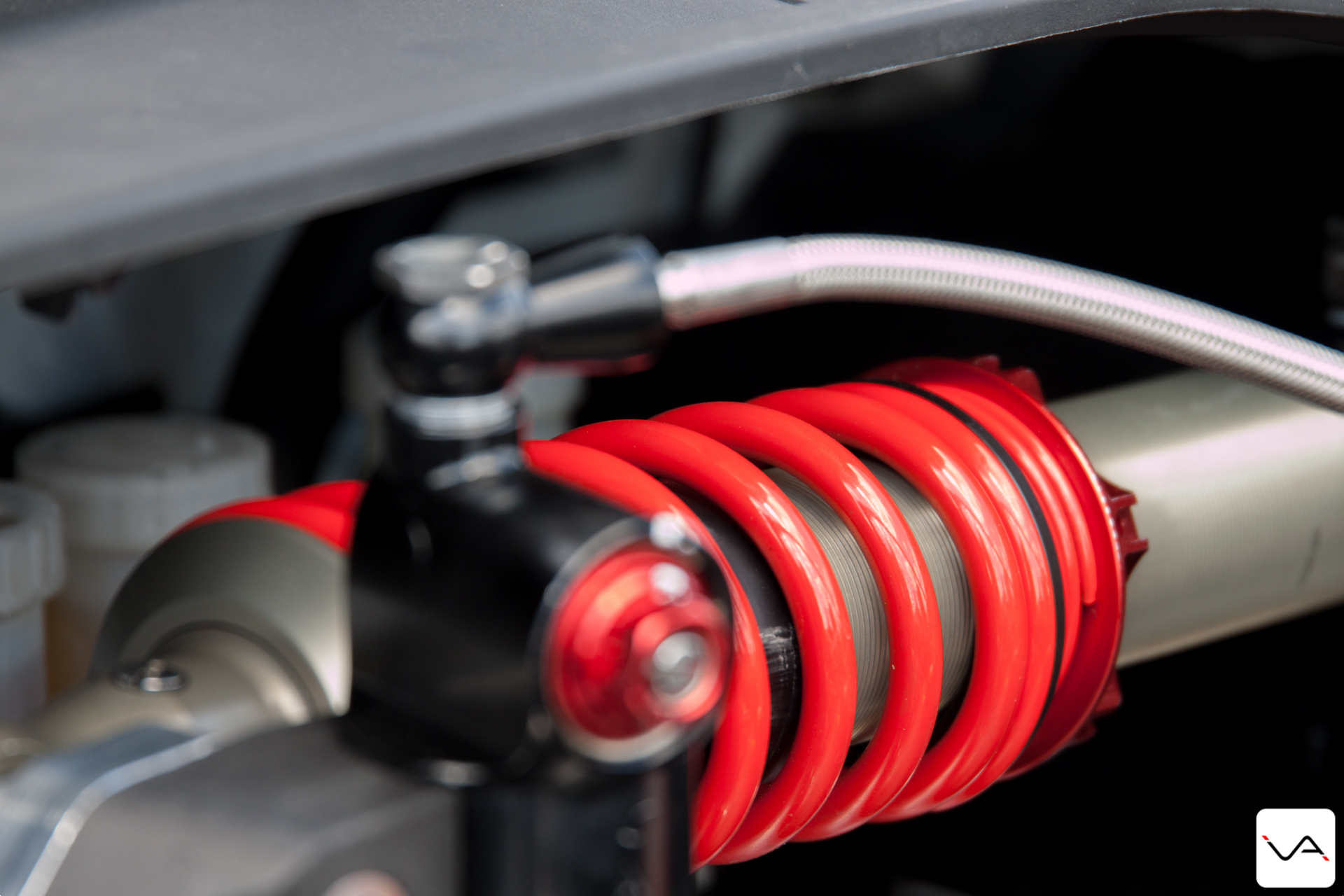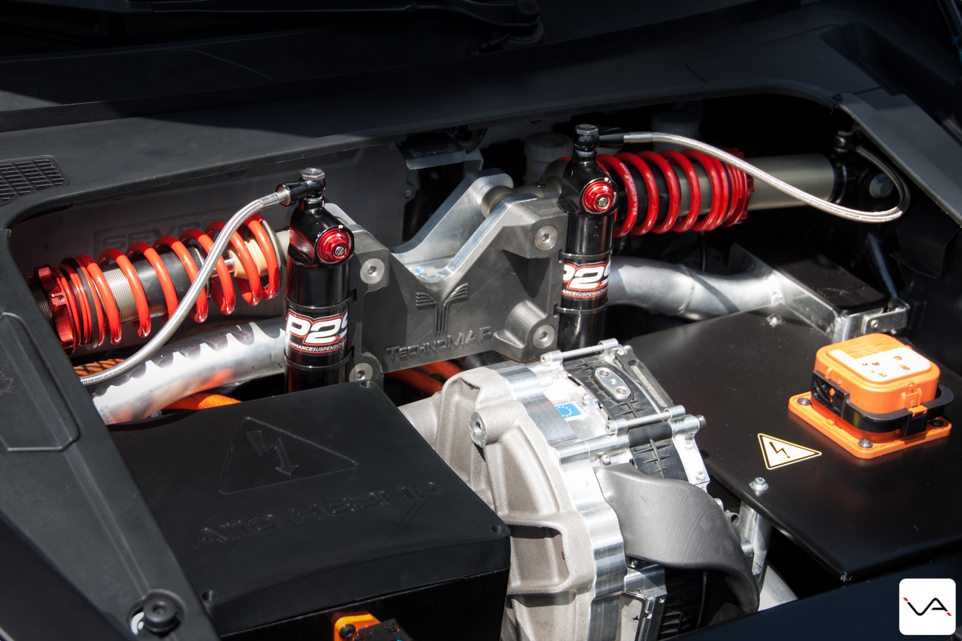 A l’avant, tout est nouveau. Le coffre a disparu, de même que le berceau et les longerons d’origine ou les trains roulants. Le tout est remplacé par des éléments sur mesure, dessinés et conçus par nos deux entreprises. Le train avant reçoit le moteur électrique et son réducteur. Ce dernier développe 200 ch et 400 Nm de couple. La suspension devient « inboard » et à l’horizontale. Cela permet à la fois une meilleure tenue de route et un gain de place non négligeable. Les pièces sont toutes magnifiques et sont de vraies pièces d’orfèvrerie.