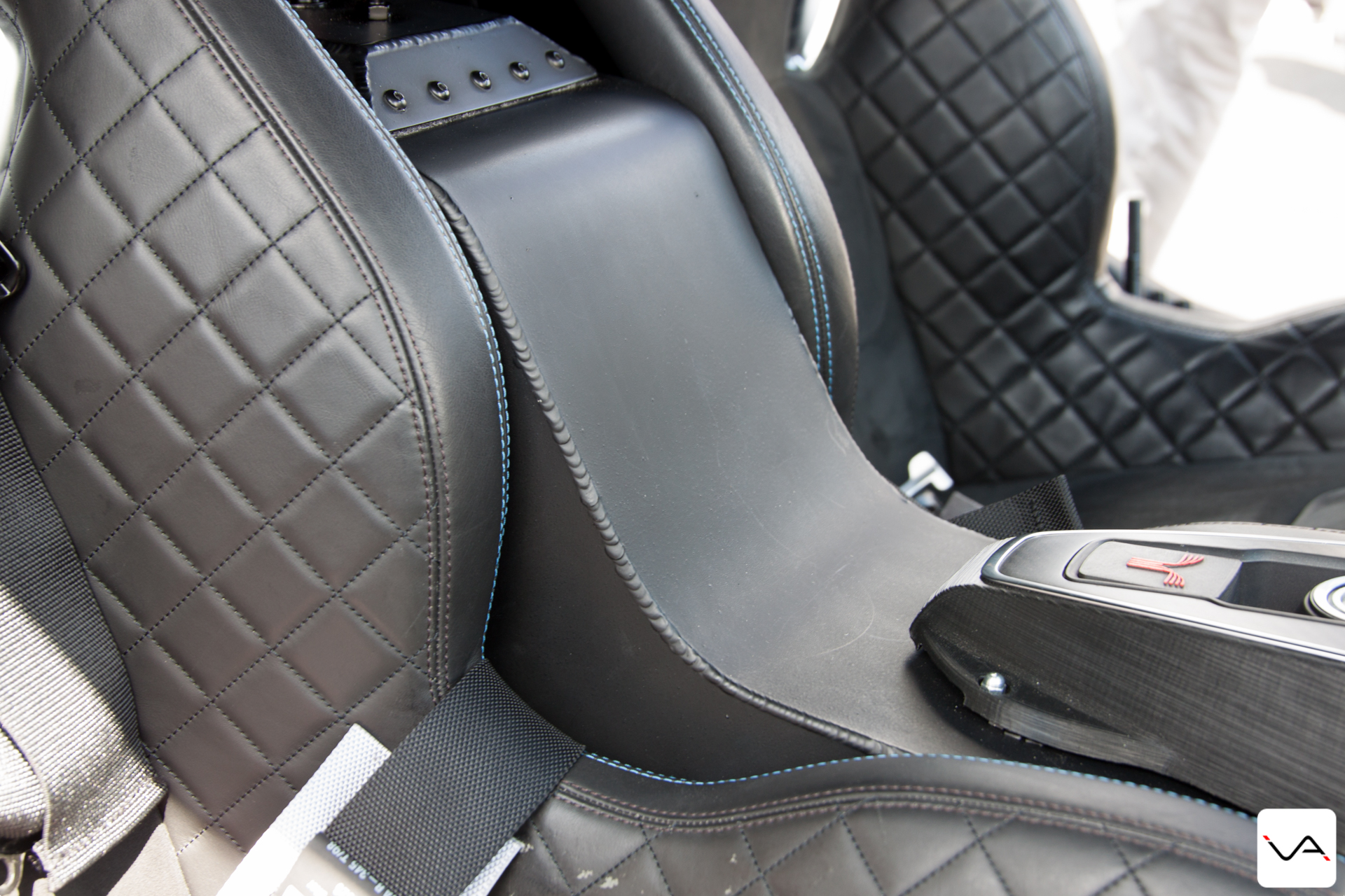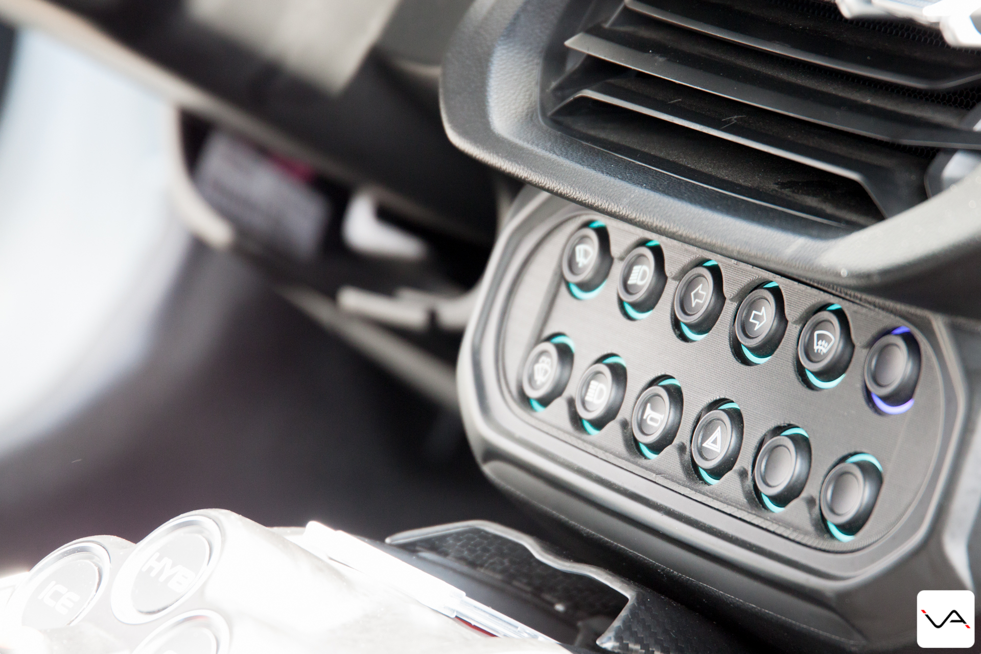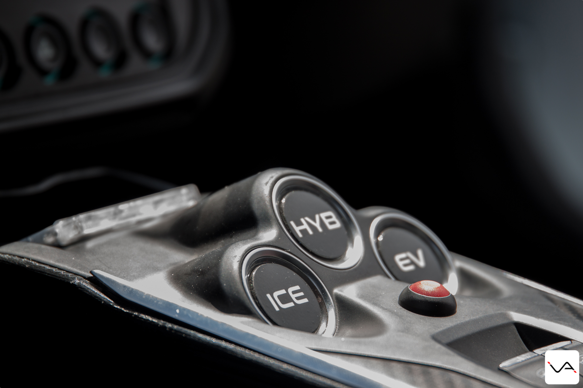 Les modifications à l’intérieur ne s’arrêtent pas à la batterie. Afin de pouvoir la positionner sous la console d’origine, les deux sièges ont dû être écartés chacun de 15 mm vers l’extérieur de la caisse. Chaque baquet reçoit un harnais 5 points. La climatisation et le système média ont disparu : inutile d’après les concepteurs ! Le volant est nouveau, de même que le haut de colonne avec de nouvelles palettes de changement de rapport. Les boutons sont personnalisés pour ne proposer que le strict minimum. Enfin, remarquez l’intégration des différents modes de conduite « thermique », « électrique » ou « hybride » en lieu et place de la commande de boite de série. Ce dernier mode lâchera les 600 ch et 800 Nm de couple sur les quatre roues.