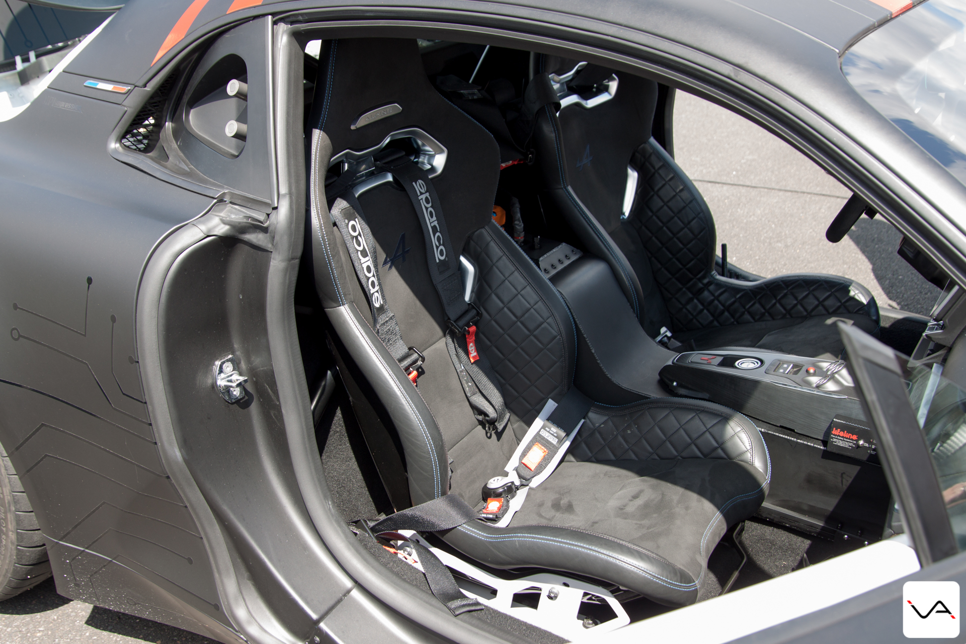 Bien harnaché dans mon baquet, je suis prêt à me laisser porter par un pilote que je ne connais pas, sur une piste de Montlhéry que je ne connais pas assez, dans une auto qui n’aurait, à ce moment-là dans ma tête, jamais du exister. On commence par un démarrage en électrique le temps de rejoindre la piste. L’Alpine HE2HP tressaute légèrement. Les bruits de roulements sont assez marqués et on s’entend à peine discuter à l’intérieur avec le pilote. L’ambiance « voiture de course » est bien présente. A l’entrée sur la piste, le pilote passe en mode thermique. Le 4 cylindre turbo démarre, juste derrière nous. On l’entend excessivement bien et il semble bien plus bruyant qu’auparavant.