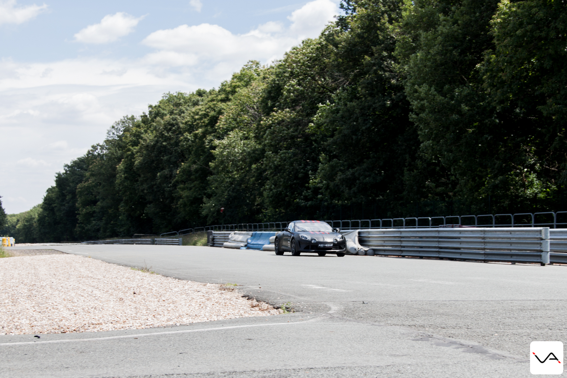 L’Alpine s’élance en se cabrant légèrement, en direction de la forêt et du circuit routier. Je suis plaqué contre mon siège, les rapports s’enchaînent en claquant et très vite, je ressens le besoin de serrer encore plus mon harnais. Comme à chaque fois dans ces situations, je trouve toujours la force de le serrer encore plus alors que je le pensais déjà au maximum. Les grands arbres bordant la piste défilent à toute vitesse. Les 100 km/h sont avalés en une poignée de secondes alors que l’Alpine atteint les 220 km/h, qui seront notre limite aujourd’hui. Si rapidement que nous nous retrouvons vite à « attendre » le prochain virage. Dans ce mode 100% thermique, la berlinette semble assez joueuse, tout en restant prévisible. J’ai l’impression de ressentir tout ce qui se passe dans le siège et ça me rappelle largement ce que j’avais ressenti en essayant l’Alpine Pure.