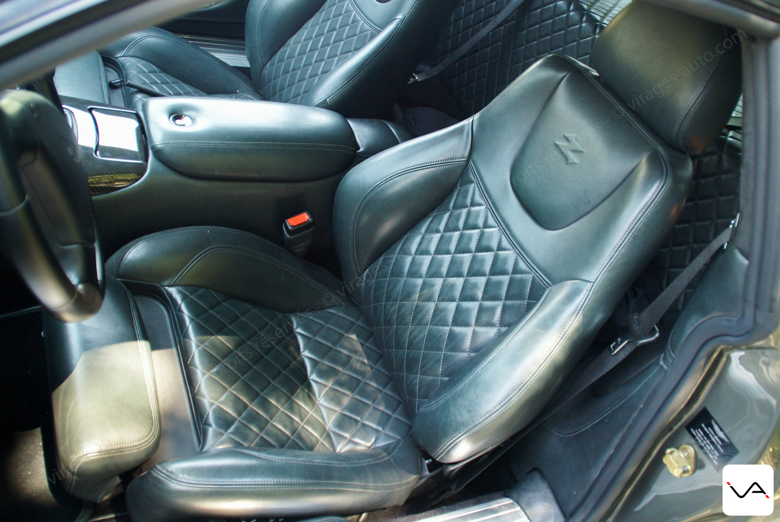 L’intérieur est en cuir et Alcantara noir Charcoal. Les placages en Aluminium illuminent un peu l’habitacle et rappellent la teinte claire de l’extérieur. La spécification US avec les feux de gabarit, le petit emplacement de plaque à l’arrière et le compteur en miles donnent un coté exotique et respectent le coté “matching”.