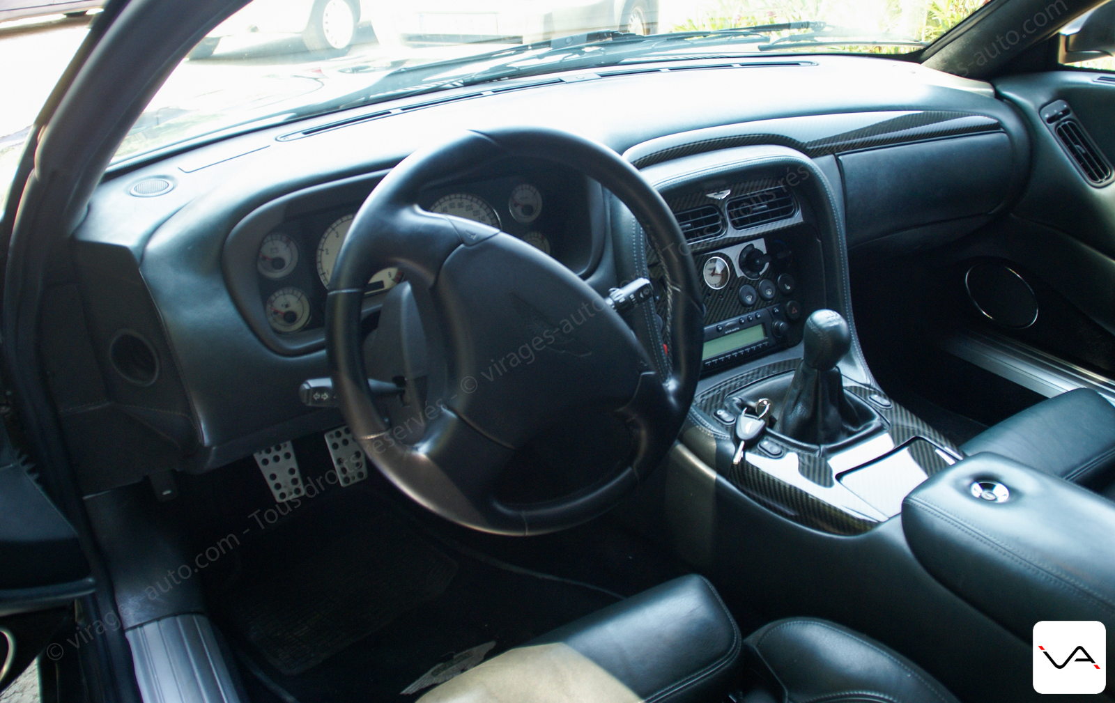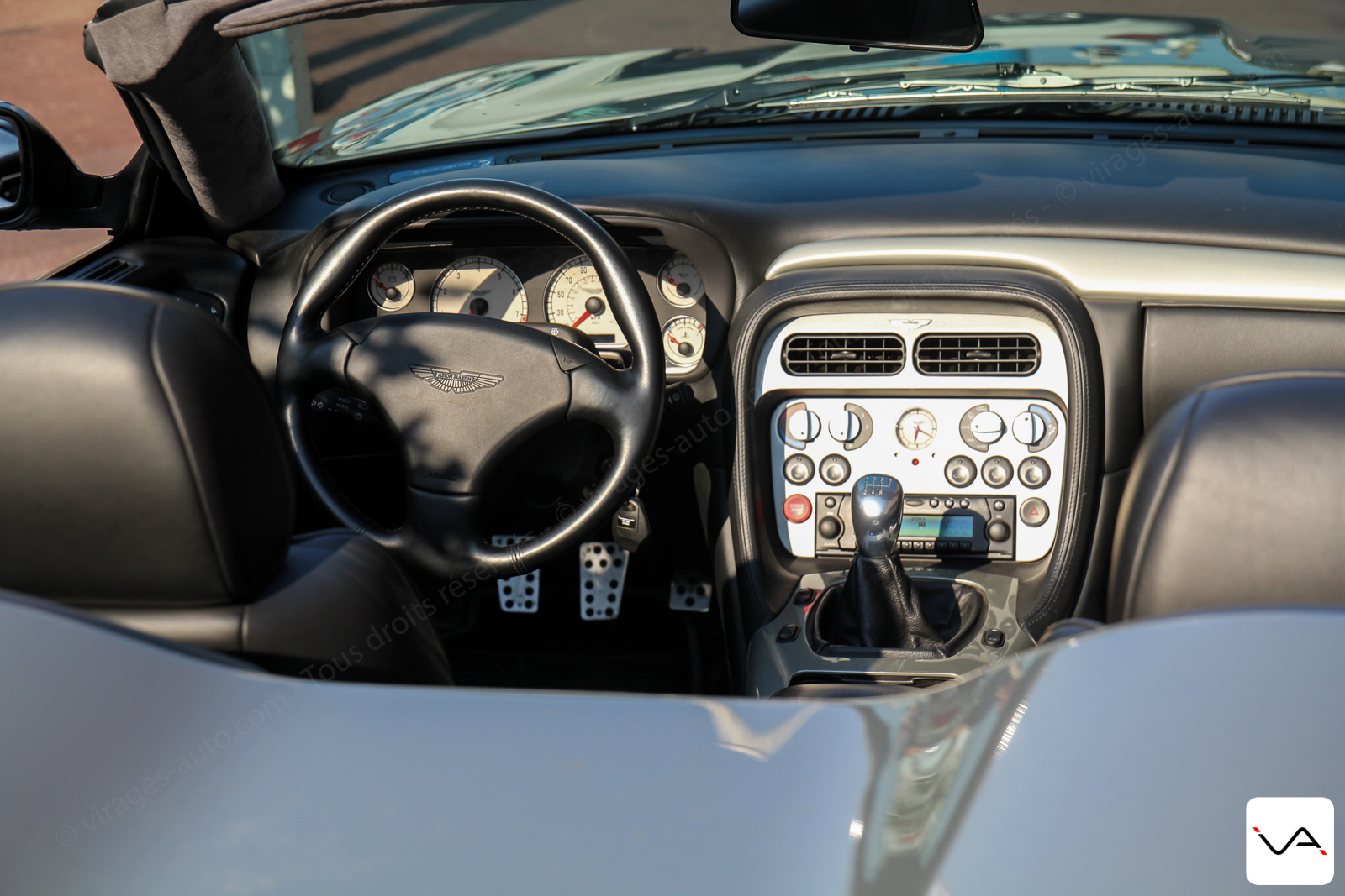 Commençons par la DB 7 Zagato. Notre exemplaire d’essai est le numéro 5, initialement vendu au concessionnaire Aston Martin de Paris. Sa teinte Mercury Grey lui donne un joli coté sportif et l’intérieur est en cuir aniline Charcoal. Non traité, ce cuir teinté naturellement se patine avec le temps, évoluant avec la vie de son propriétaire : sa teinte passe du noir au vert foncé. Les placages en fibre de carbone tranchent et donnent un côté moderne et technologique.