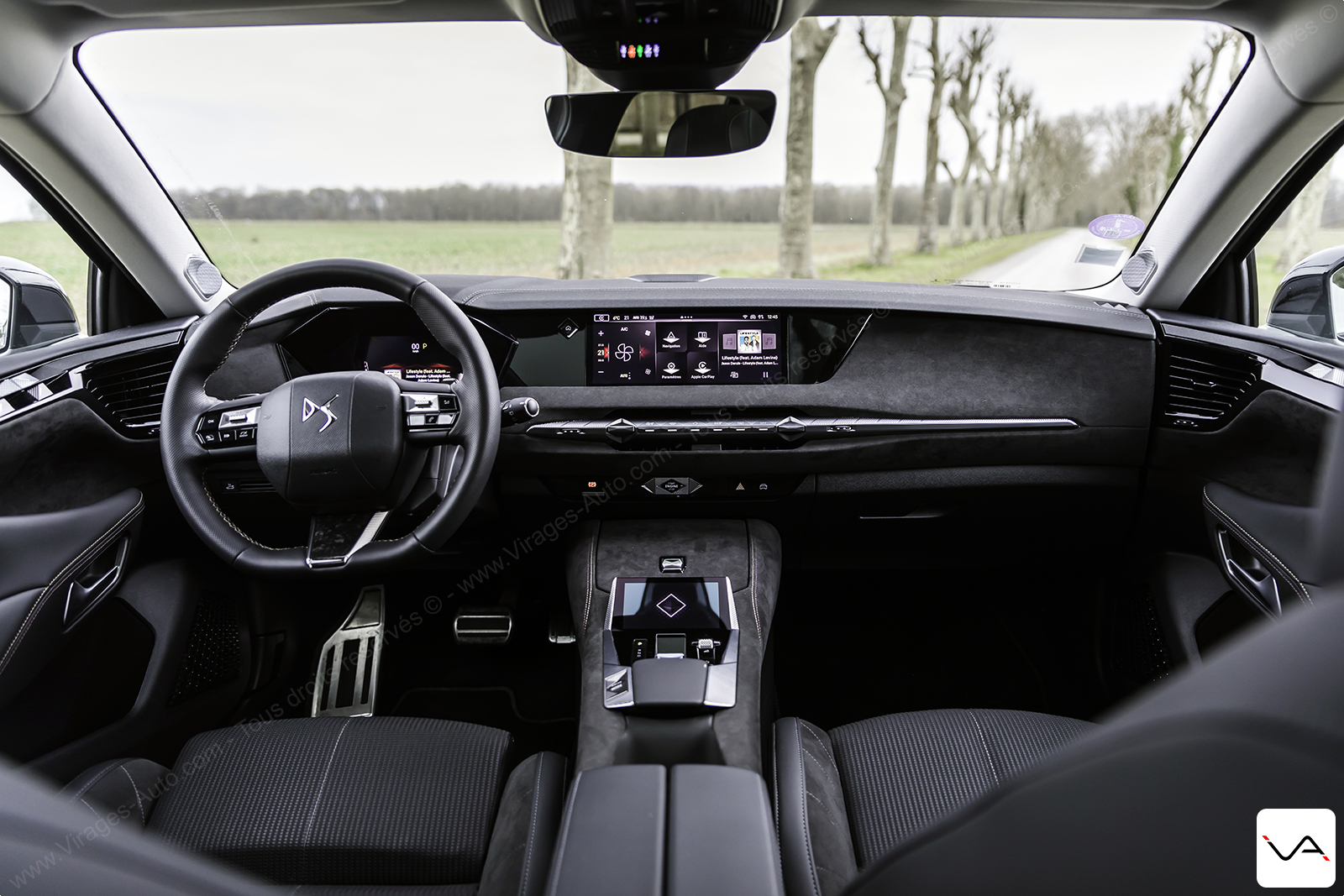 Passé ces petites déceptions, je me retrouve tout de même à bord d’une voiture très agréable à rouler. Les sièges sont confortables, la tenue de route est très bonne et l’insonorisation se montre de bonne qualité. Les pneumatiques se montrent tout de même assez bruyant vers 120 km/h. Les roues de 20’’ rendent de plus l’amortissement un peu raide. A noter qu’une option DS Active Scan Suspension existe, mais n’est malheureusement pas présente sur notre véhicule d’essai. On appréciera également les projecteurs DS Matrix LED Vision qui offrent un éclairage de grande qualité, en plus d’être beaux a regarder.