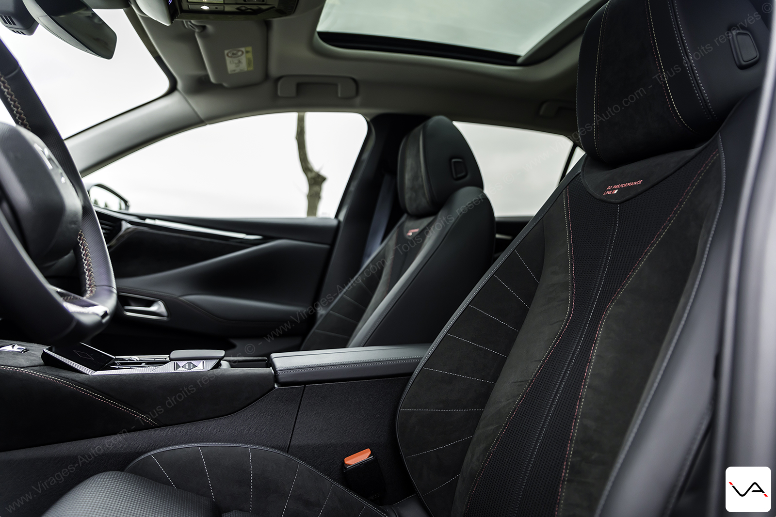A l’intérieur, l’envie de monter en gamme se fait également sentir. Notre DS 4 d’essai propose des sièges en Alcantara noir qui illustrent le coté « sportif » de la finition Performance Line +. Cet Alcantara se retrouve également sur la console centrale et la planche de bord. Le reste se part de plastiques moussés bien assemblés et qualitatifs. Cette finition de très belle facture renforce la qualité perçue et le coté premium recherché. A l’arrière par contre, on sent que les passagers ont été oubliés, et on redescend en gamme.
