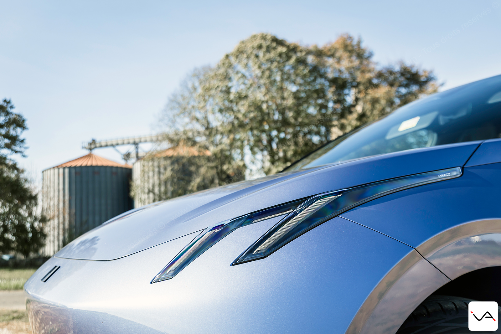 Son regard est la première chose qui frappe. Perchées tout en haut du capot, ces deux “dents” de lumière — signature maison — lui donnent un air mêlant originalité et assurance. Certains trouveront ça étrange, d’autres audacieux, mais impossible de rester indifférent. La voiture affiche clairement son identité. Un peu plus bas, les optiques principales se fondent dans un bouclier aux lignes tendues. Ce bouclier contraste avec la silhouette pourtant globalement arrondie. En réalité, sous ses airs de petit SUV tout doux, le 02 multiplie les lignes de style nettes et marquées. Cela renforce l’impression de robustesse que les photos ne retranscrivent pas toujours.