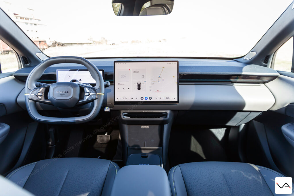 Avec ses 4,49 m de long, 1,53 m de haut et 1,89 m de large, le 02 reste dans des proportions contenues. Le toit noir de cette version More renforce visuellement cette compacité, en “cassant” la hauteur perçue. L’arrière façon fastback participe aussi à ce sentiment. Bref, ce véhicule paraît plus petit qu’il ne l’est réellement, ce qui le rend très agréable en zone urbaine. Côté plateforme, rien de méconnu : le 02 repose sur la base SEA du groupe Geely, que partagent notamment les Smart #1, Smart #3, la Zeekr X et le Volvo EX30. Une base moderne, efficace et déjà éprouvée.