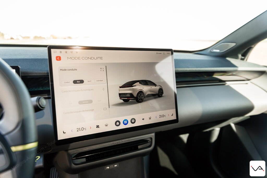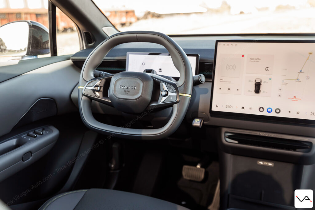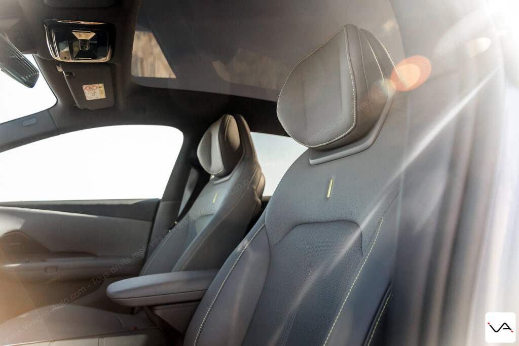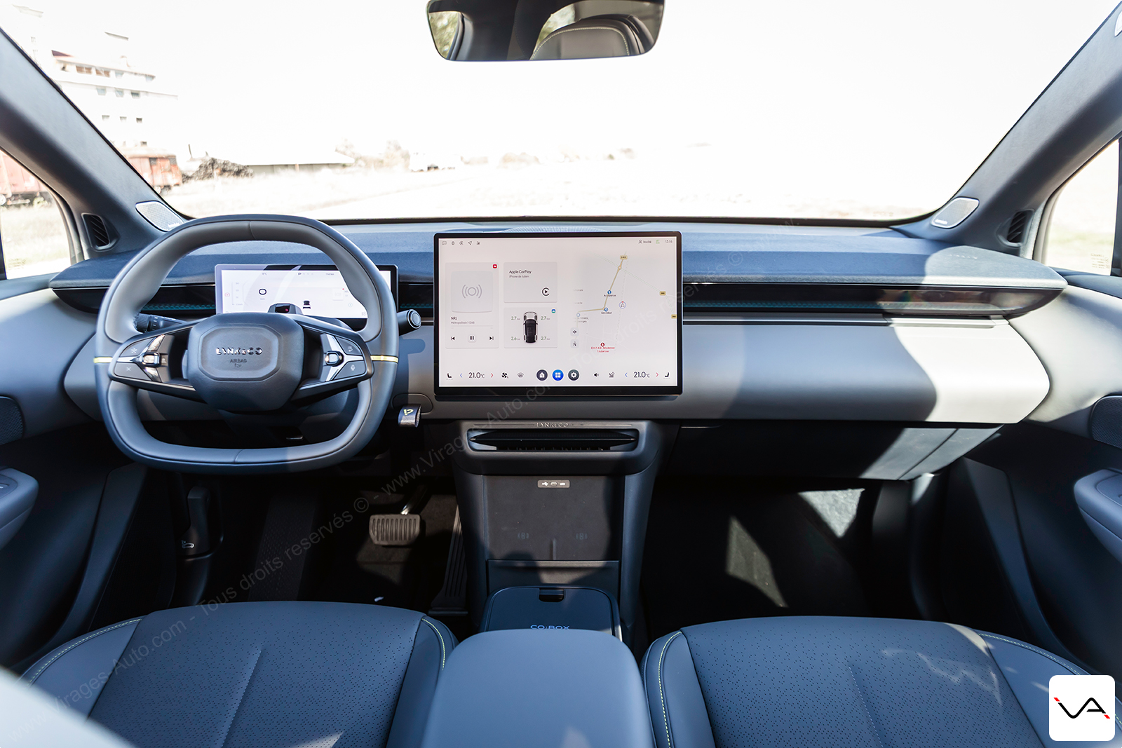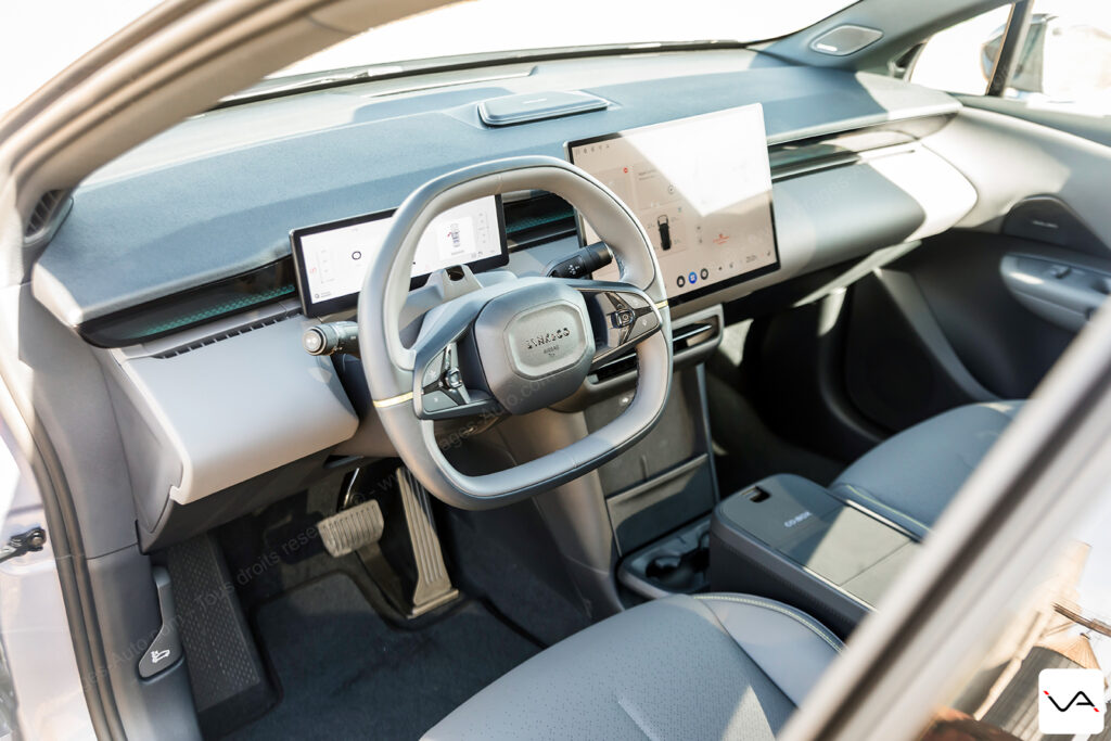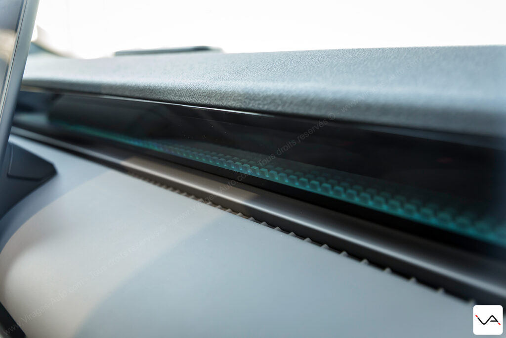 Dès l’ouverture de la porte, la première claque vient de la sellerie en cuir artificiel clair, perforée avec un joli dégradé graphique. C’est frais, lumineux et visuellement très premium. Les petites touches de jaune anodisé, les surpiqûres colorées, et surtout l’incroyable éclairage d’ambiance baptisé Infinity, créent une atmosphère presque lounge. À bord, tout paraît pensé pour donner le sourire. Rien n’est triste ou fade, un vrai parti pris esthétique. La planche de bord confirme cette impression positive. Les matériaux sont bien choisis et les ajustements sérieux.
