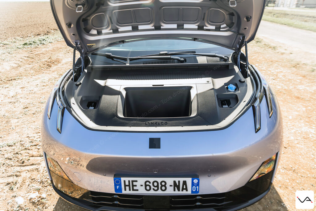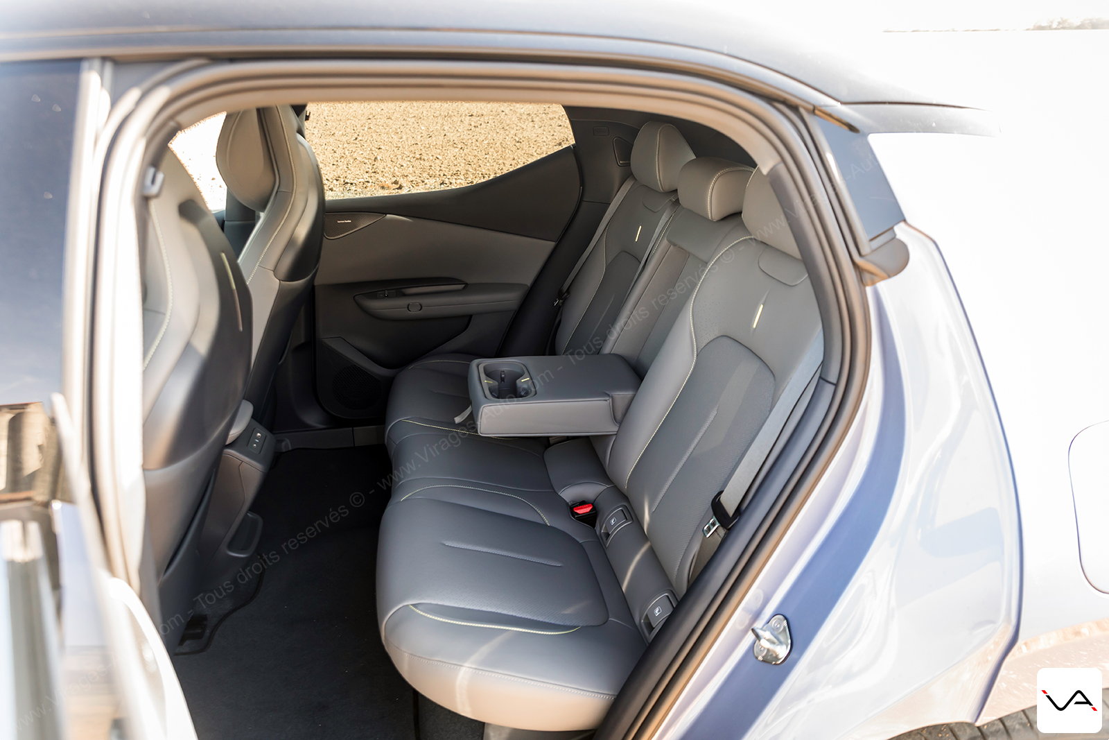 Les sièges avants, chauffants, offrent un bon confort général et un maintien convaincant pour un modèle de ce gabarit. À l’arrière, le 02 révèle naturellement ses limites de petit SUV : les grands gabarits ne seront pas forcément à la fête. Cependant l’espace reste correct pour des trajets ordinaires. De plus, le beau toit vitré apporte une sensation d’ouverture bienvenue. Côté coffre, on profite de 410 litres à l’arrière auxquels s’ajoutent 15 litres supplémentaires dans le frunk. Rien de révolutionnaire, mais suffisant pour la majorité des usages avec une modularité simple et efficace. Bref, impossible de s’ennuyer à bord du Lynk & Co 02. La marque a voulu proposer quelque chose de frais et de différent. Force est de constater que l’objectif est largement atteint. C’est beau, bien construit, sympa à vivre, et rempli de petits détails qui donnent une vraie personnalité à l’habitacle.