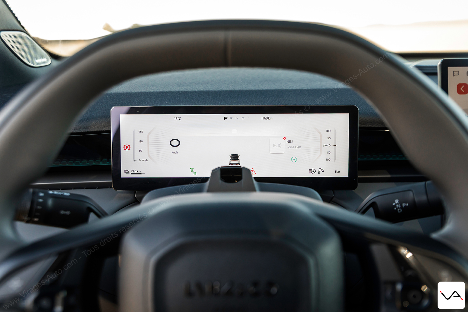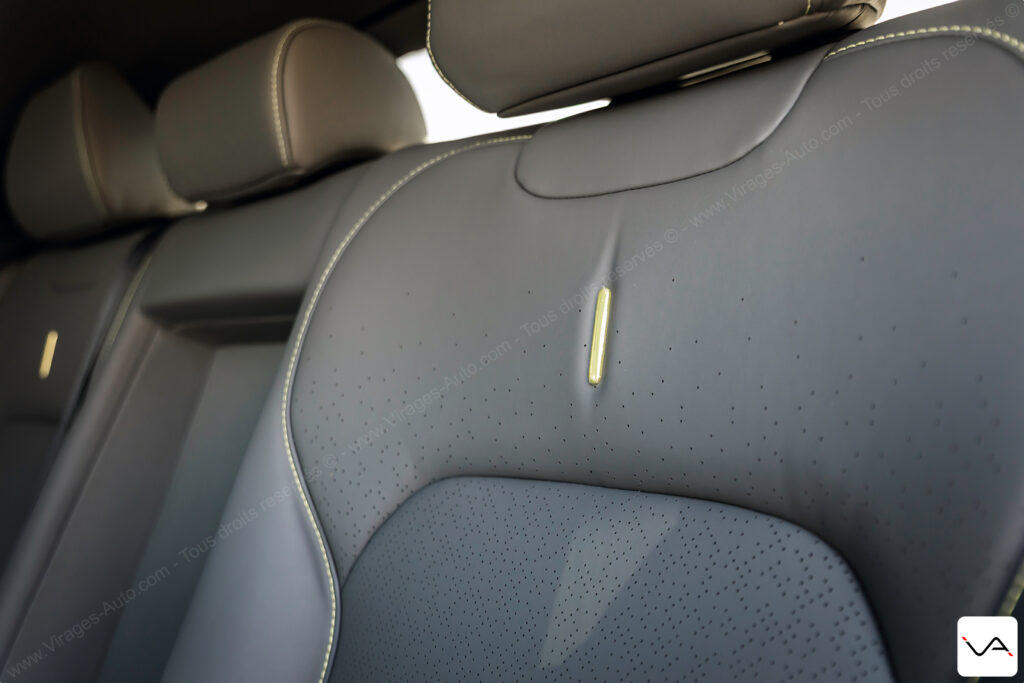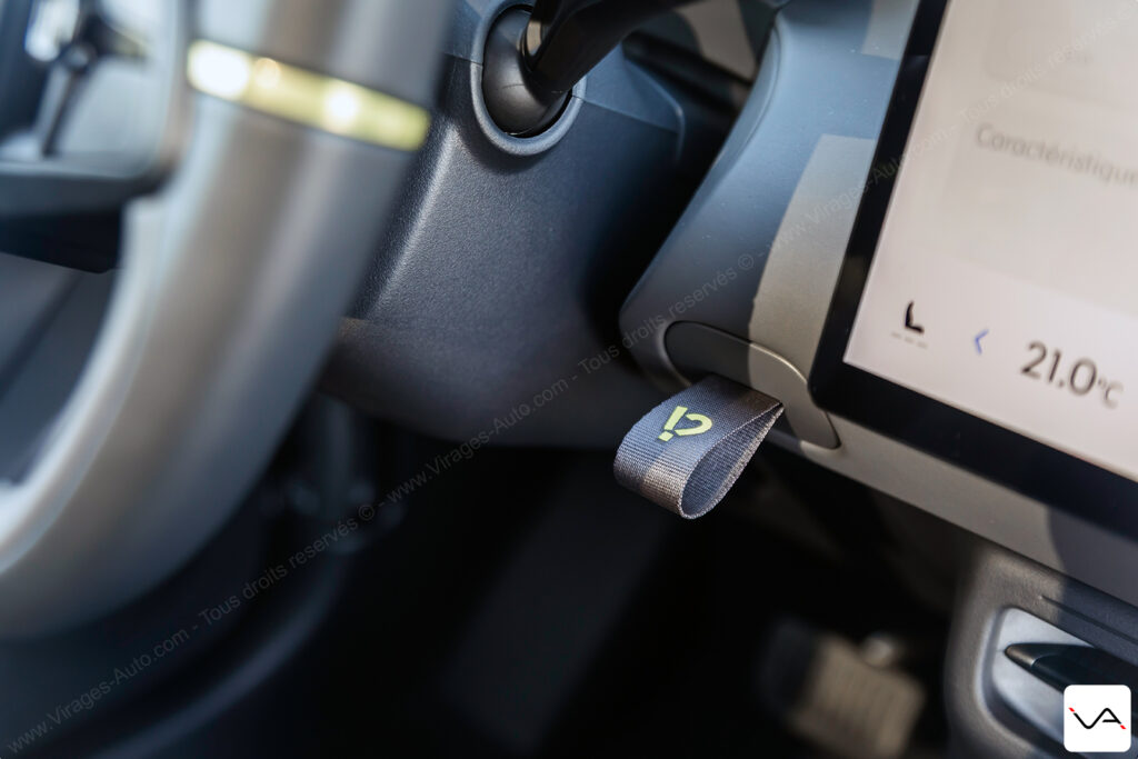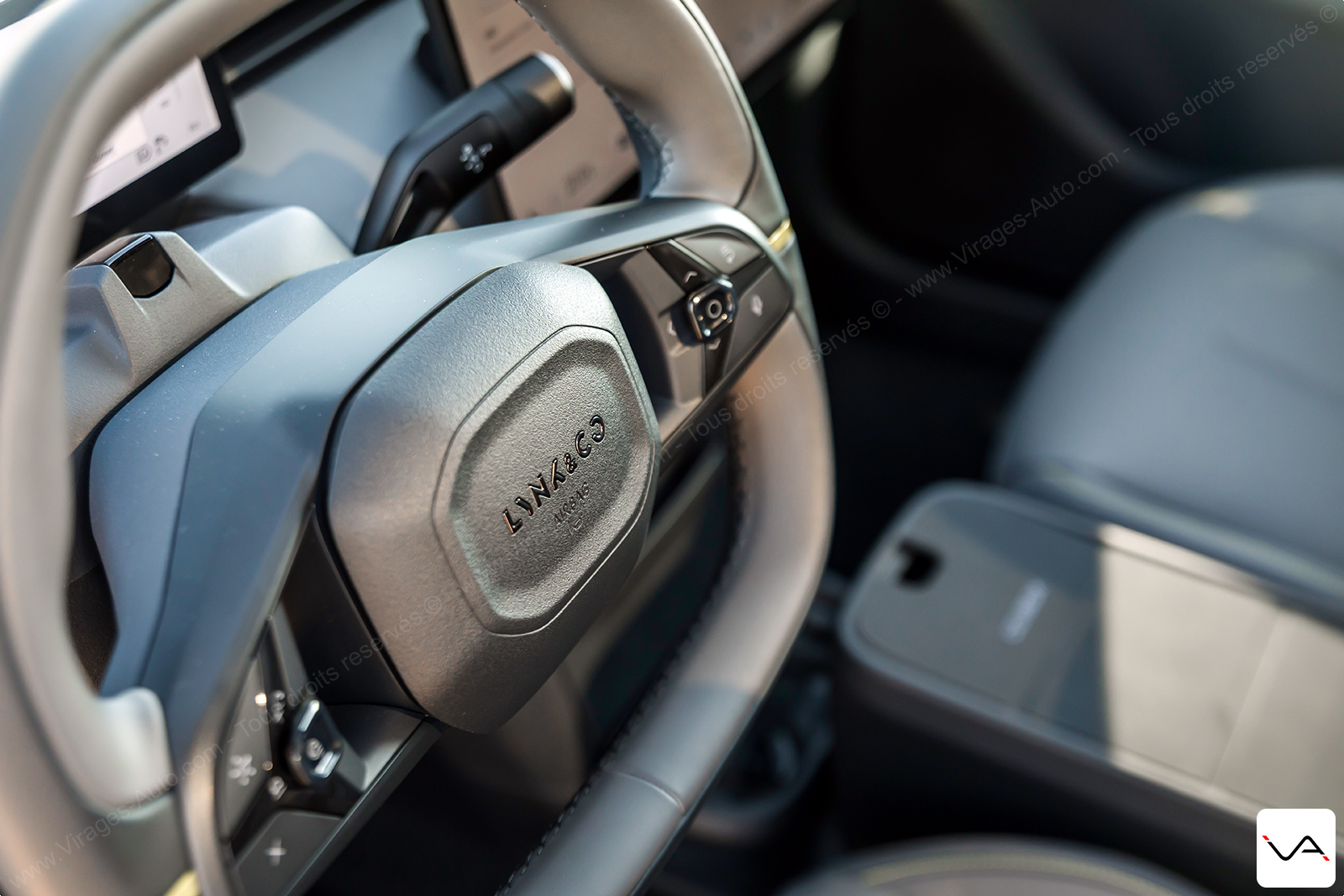 Autre détail amusant à droite du volant, une sangle avec un logo jaune fluo ornée d’un point d’interrogation. Elle n’est pas là pour faire joli : c’est un raccourci dédié à un mode d’utilisation plutôt rare chez nous : l’auto-partage. Ainsi, tirer sur la sangle permet d’activer l’application d’auto-partage ou de démarrer la voiture lorsqu’on la loue via un propriétaire. Un clin d’œil à l’ADN de Lynk & Co, qui, rappelons le, ne vendait initialement ses modèles qu’en location et en partage. Même si la stratégie commerciale a évolué depuis, cette fonctionnalité reste intégrée et pleinement assumée.