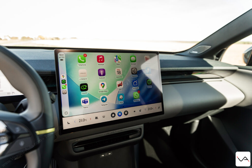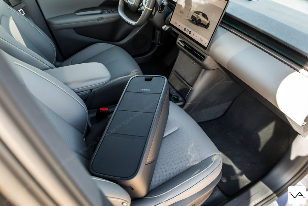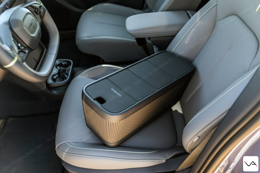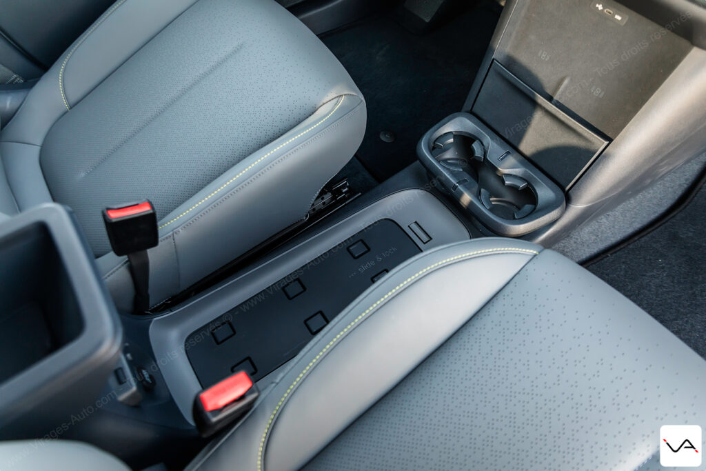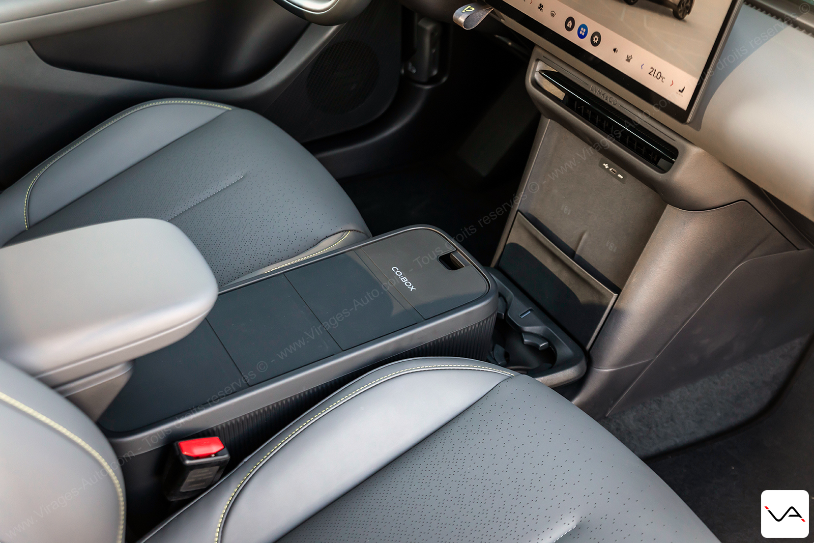 Du côté des aspects pratiques, Lynk & Co s’autorise quelques idées originales. On retrouve par exemple un double chargeur à induction presque vertical accompagné d’un système de maintien du téléphone. C’est simple et efficace. Juste en dessous se cache un grand vide-poche amovible pensé pour être transporté comme une petite boîte à objets. Sur le principe, c’est malin ; dans la pratique, un peu moins ergonomique… Mais l’idée a le mérite d’exister et participe à cette ambiance ludique propre à la marque.