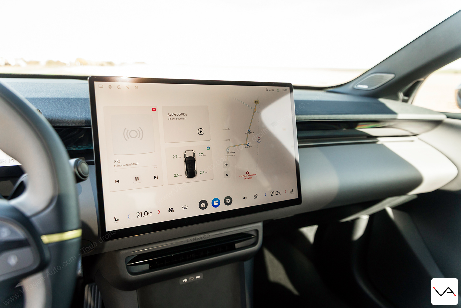 On ne s’attendait pas forcément à un niveau de finition aussi élevé dans une marque encore méconnue chez nous. Mais force est de constater que le 02 tient tête à des rivaux bien plus établis. Le volant dispose d’une jante épaisse juste comme il faut. Cela ajoute une touche sportive bienvenue et tombe parfaitement sous la main. Il fait face à un premier écran de 10,2 pouces, discret mais utile. De son côté, l’écran central de 15,4 pouces concentre l’essentiel des fonctions.