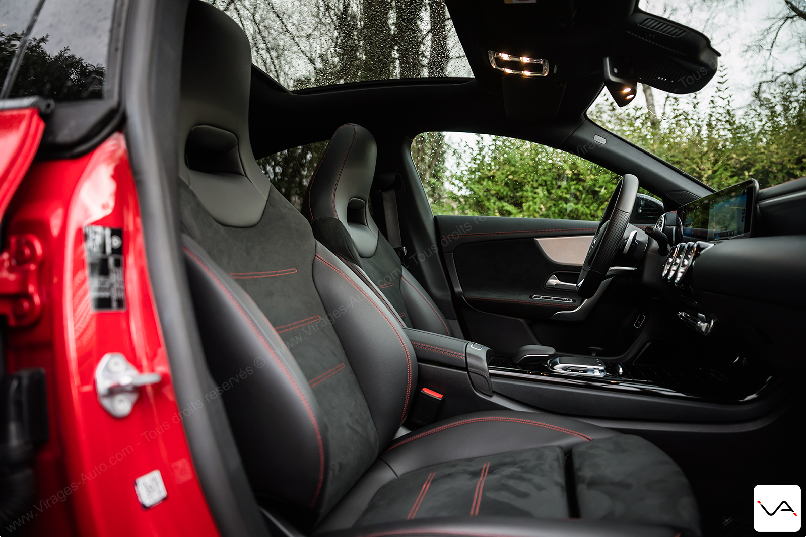 A l’intérieur on joue la carte de la classe sportive avec des sièges sports dans une finition simili cuir / microfibre Dinamica de plus bel effet. A cela s’ajoute les surpiqures rouges. Pour parfaire la finition déjà très bonne, notre modèle d’essai est équipé du Pack Premium Plus (3.500 €). Celui-ci comprend notamment les sièges électriques chauffants à mémoire de position, le toit ouvrant panoramique, le double écran 10’’, les éclairages d’ambiance dans les aérateurs mais également les projecteurs Multibeam LED matriciels. Un équipement plus que complet donc pour cette auto vendue 48.450 € dans notre configuration.