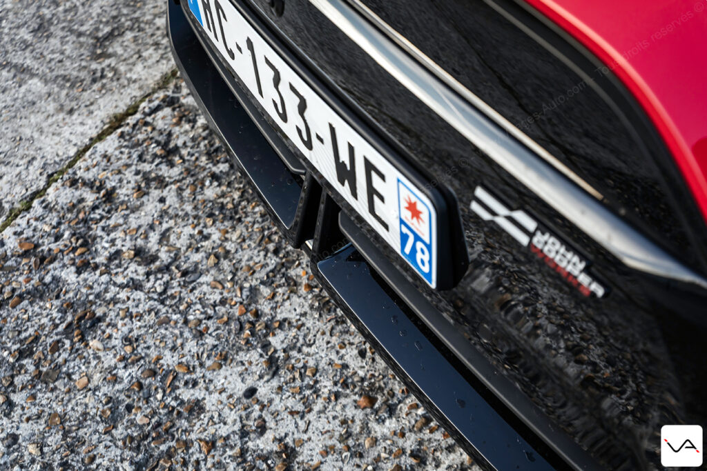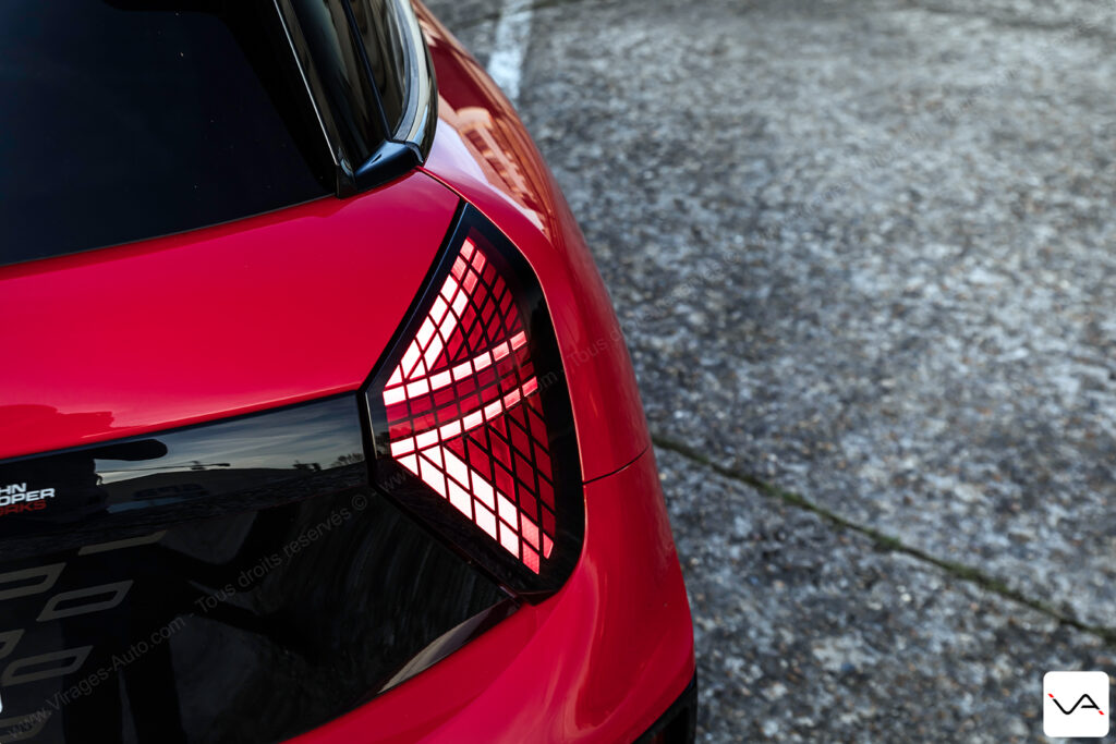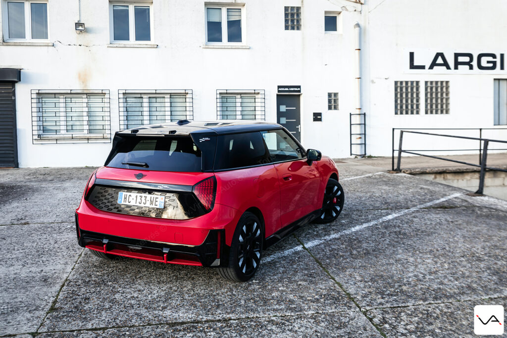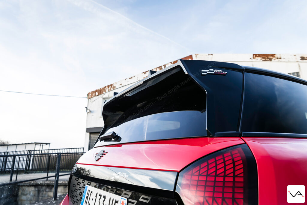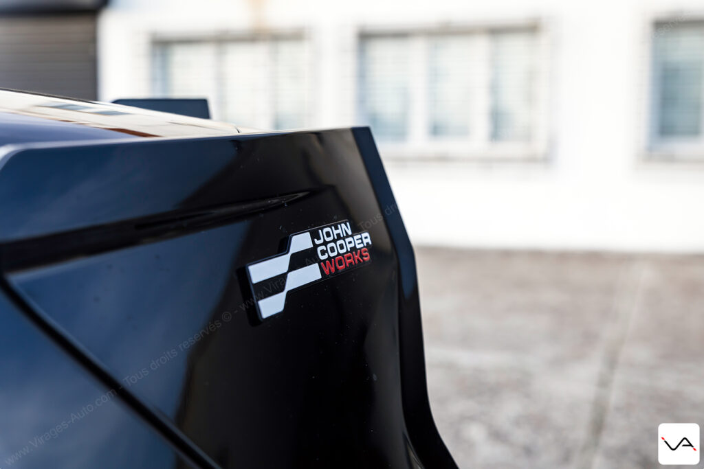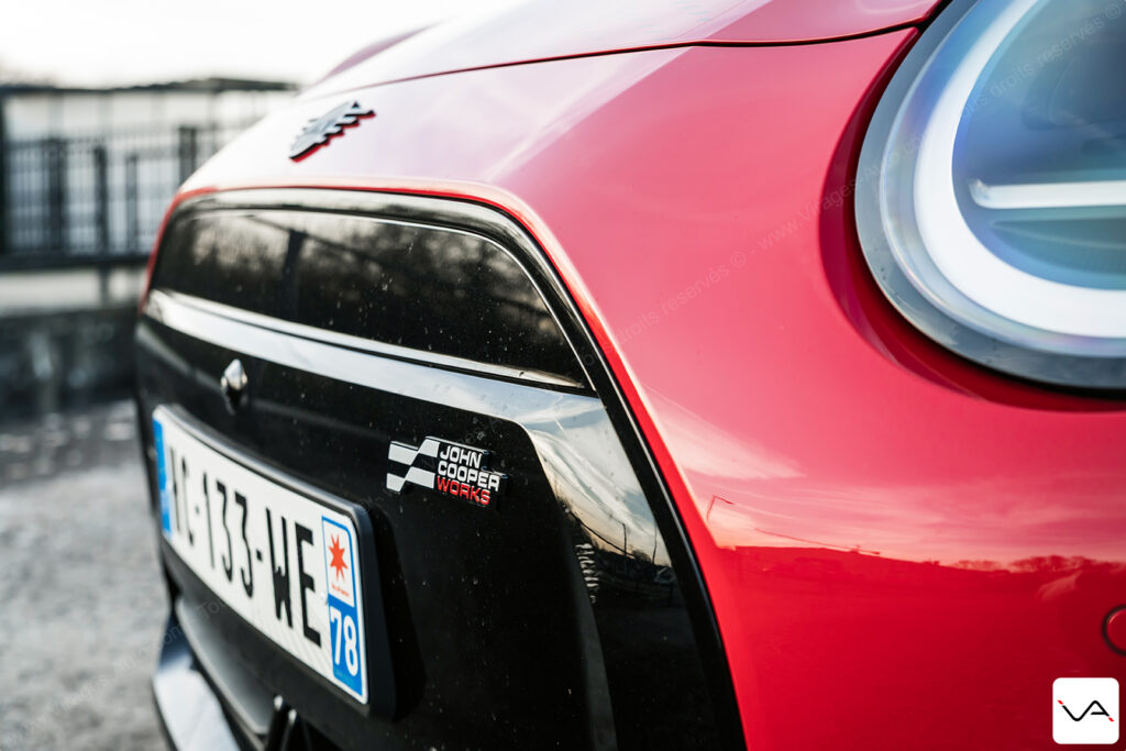 À l’arrière, le discours est nettement plus agressif. La large bande noire ornée d’un damier ton sur ton sur le hayon, le becquet massif et le faux diffuseur en partie basse du pare-chocs renforcent clairement le tempérament sportif de l’auto. Si l’ensemble reste proche de la finition JCW classique, cette partie arrière permet, cette fois, d’identifier plus facilement une version à vocation dynamique. Fidèle à ses origines, la marque MINI continue également d’afficher fièrement l’Union Jack sur les feux arrière. Rappelant que malgré son intégration depuis de nombreuses années dans le giron du groupe BMW, son ADN britannique reste pleinement assumé.