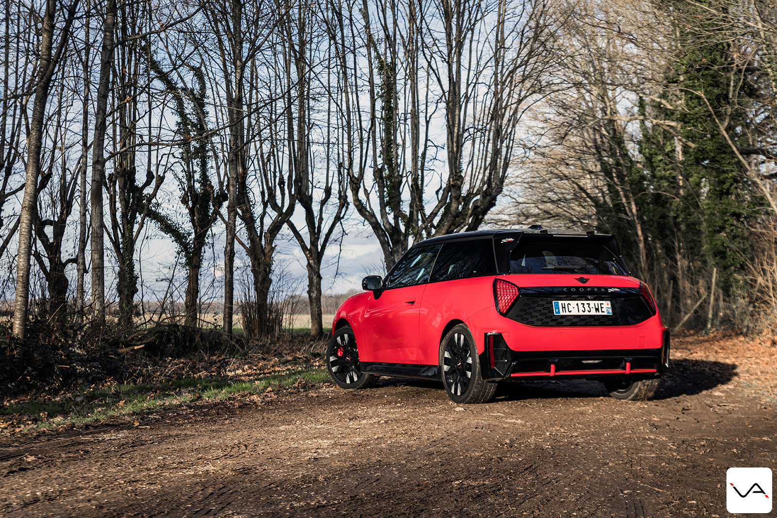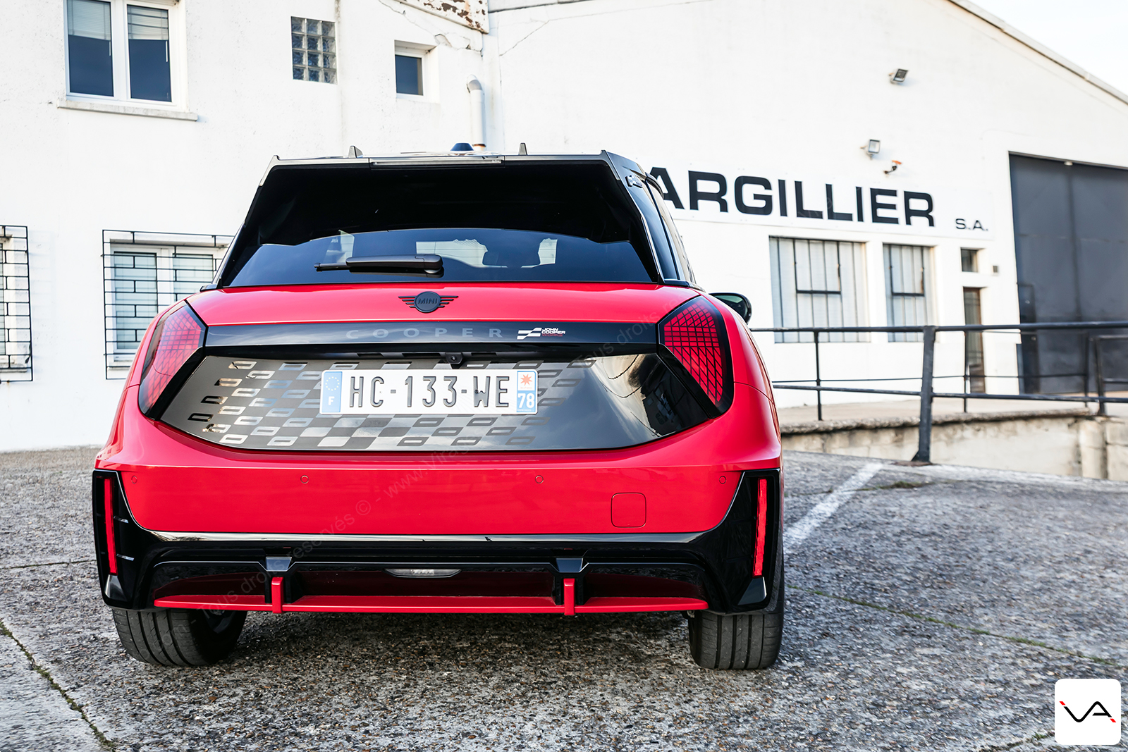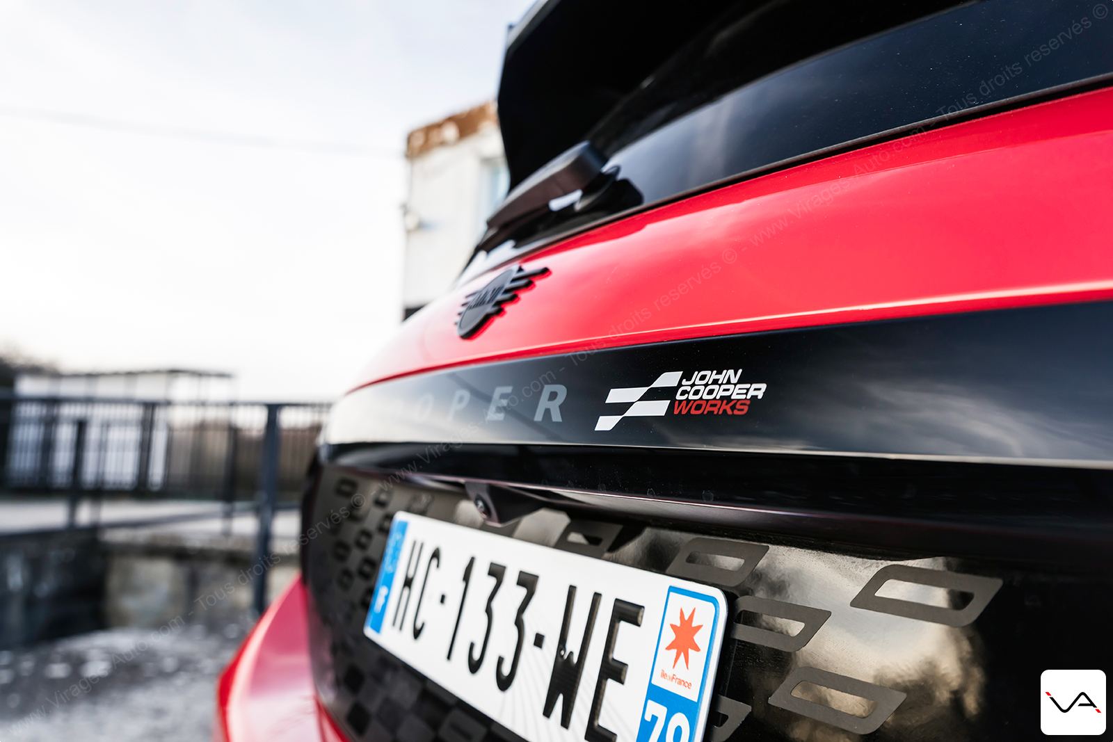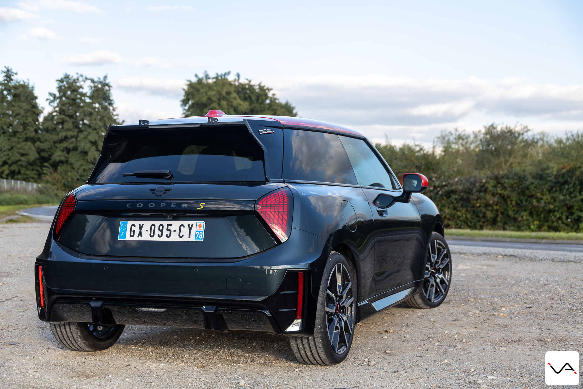 À l’arrière, le discours est nettement plus agressif. La large bande noire ornée d’un damier ton sur ton sur le hayon, le becquet massif et le faux diffuseur en partie basse du pare-chocs renforcent clairement le tempérament sportif de l’auto. Si l’ensemble reste proche de la finition JCW classique, cette partie arrière permet, cette fois, d’identifier plus facilement une version à vocation dynamique. Fidèle à ses origines, la marque MINI continue également d’afficher fièrement l’Union Jack sur les feux arrière. Rappelant que malgré son intégration depuis de nombreuses années dans le giron du groupe BMW, son ADN britannique reste pleinement assumé.