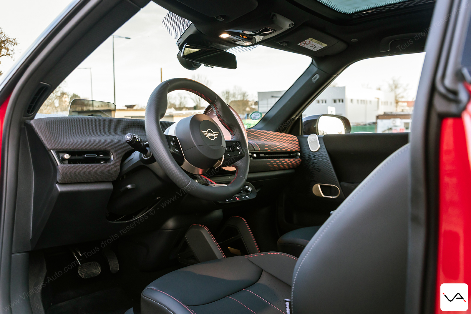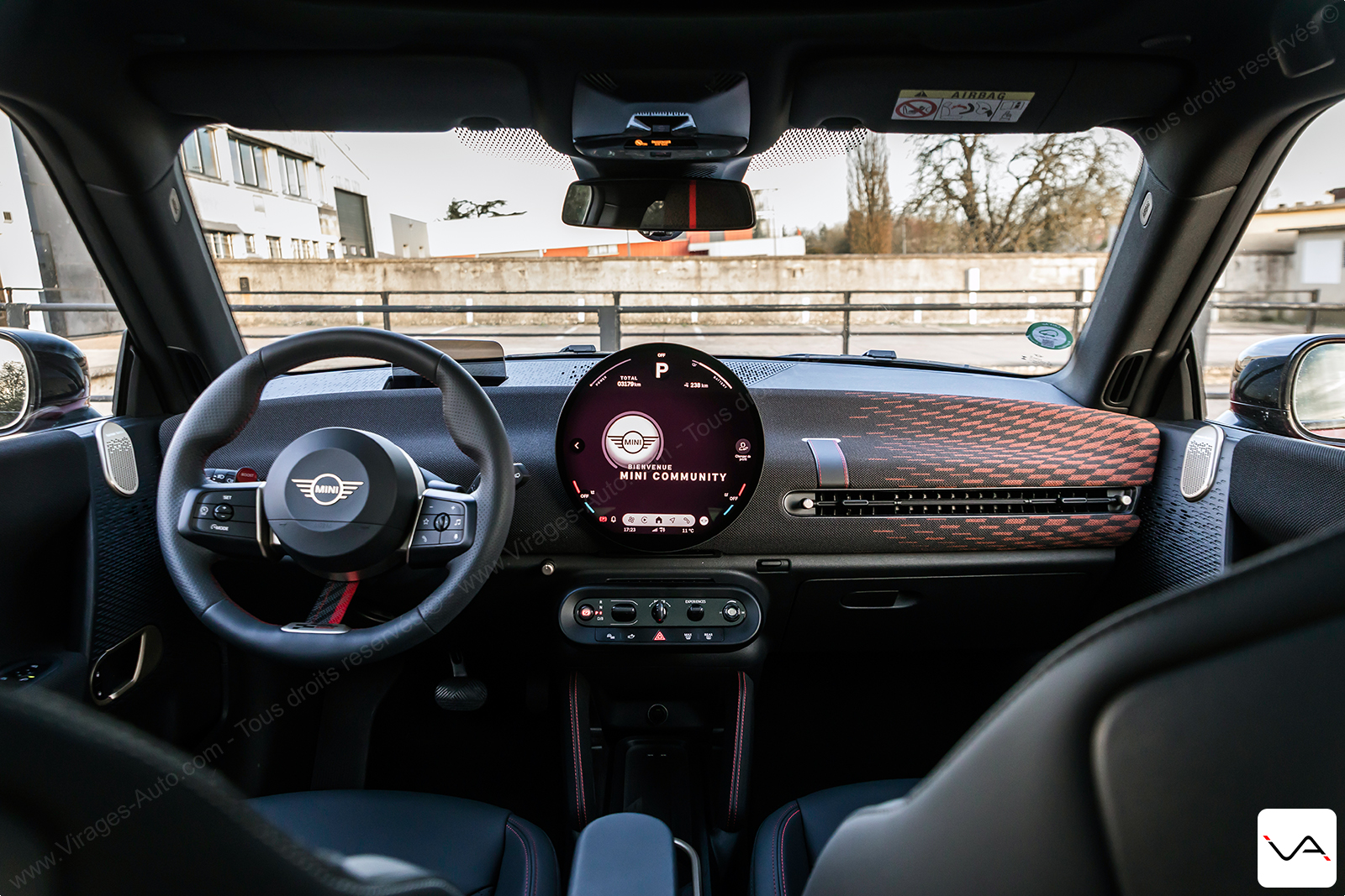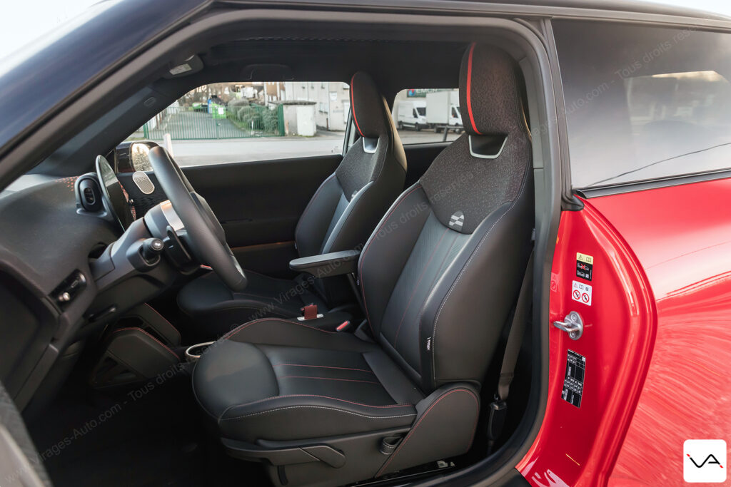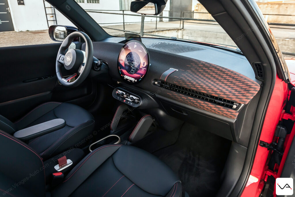 Face au conducteur, la dotation technologique est complète. L’affichage tête haute projette une grande quantité d’informations et adapte son graphisme au mode de conduite sélectionné. Ces derniers sont au nombre de sept, avec des appellations évocatrices comme Green ou Go-Kart, et participent pleinement à l’expérience à bord. La sellerie, associant cuir et tissu, se montre agréable à l’œil et cohérente avec le positionnement de l’auto, mais laisse un léger sentiment d’inachevé. Si le dessin est réussi et le confort bien présent, MINI fait ici l’impasse sur des sièges spécifiques à la version John Cooper Works, comme cela a pourtant pu être le cas sur les anciennes déclinaisons plus sportives de la marque. Un choix regrettable, tant cette JCW E aurait gagné en caractère avec une assise plus marquée visuellement et un maintien latéral renforcé, permettant de la distinguer plus nettement du reste de la gamme.