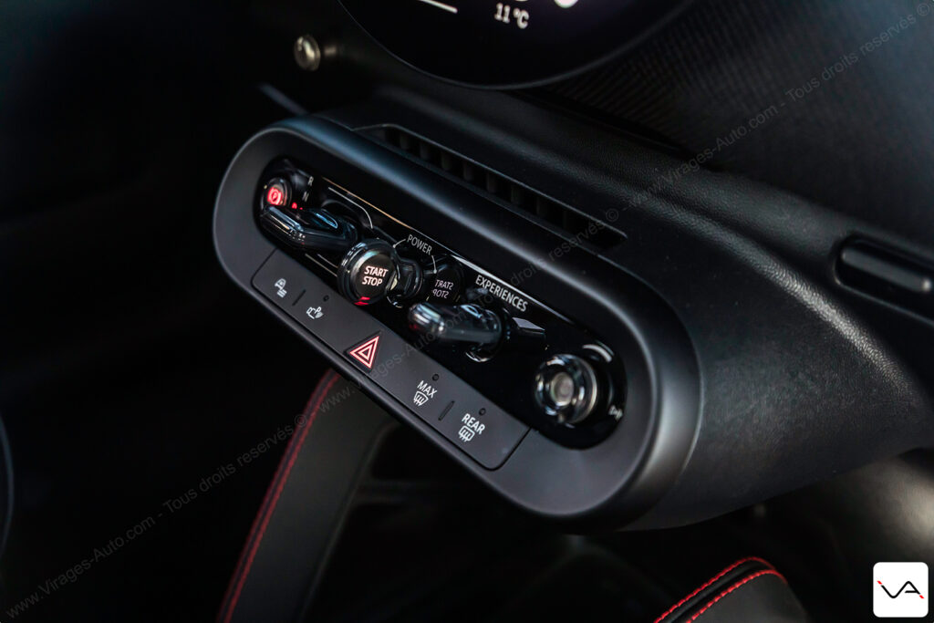 MINI se distingue en revanche par son travail sur l’éclairage d’ambiance. Aux traditionnelles sources lumineuses intégrées aux panneaux de porte et à la partie basse de la planche de bord s’ajoutent des projections graphiques directement sur cette dernière, évoluant elles aussi selon le mode de conduite choisi. Plus original encore, un éclairage en damier entoure le toit panoramique, rappelant subtilement l’univers John Cooper Works et renforçant cette atmosphère ludique et technologique propre à la marque. En contrepartie, les aspects pratiques restent secondaires : l’accès aux places arrière n’est pas des plus aisés, configuration trois portes oblige, l’habitabilité y est comptée pour les grands gabarits et le coffre, limité à 210 litres, ne bénéficie d’aucun frunk pour compenser.