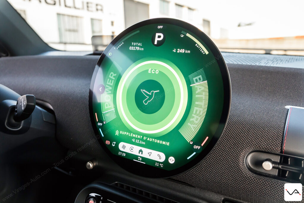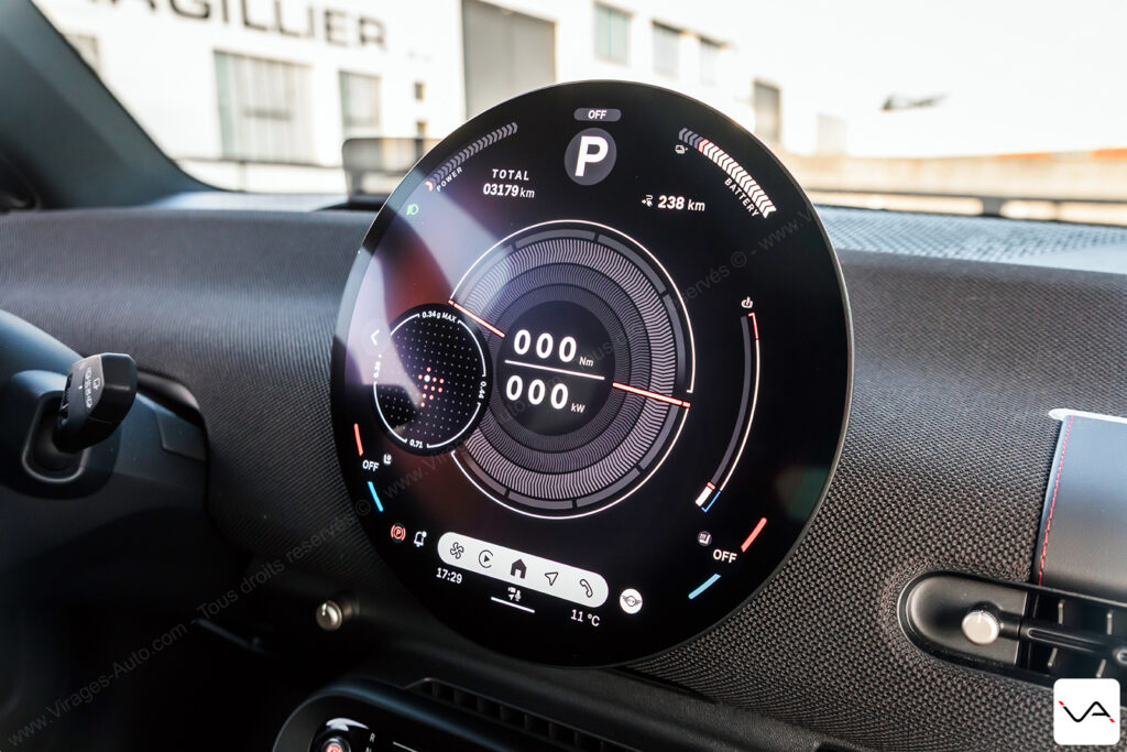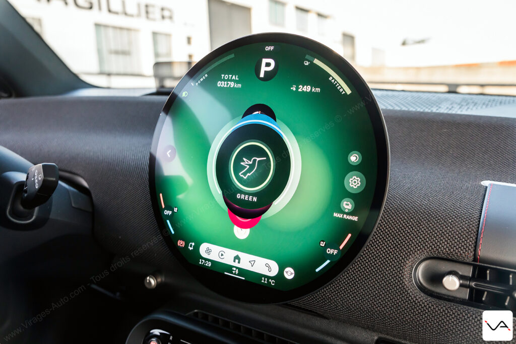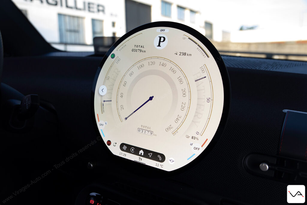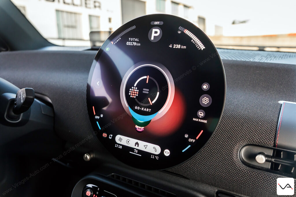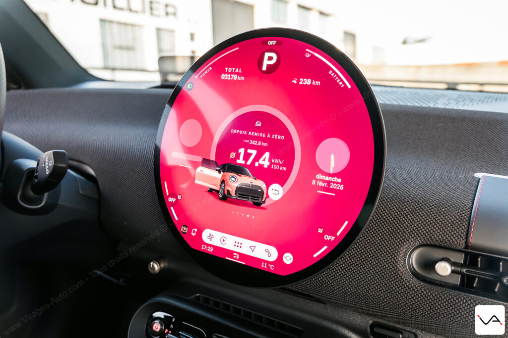 Sur ces trajets du quotidien, la MINI JCW E sait toutefois se montrer flatteuse sur le plan technologique. Le système de navigation avec réalité augmentée se révèle particulièrement efficace en ville. Il facilite la lecture des intersections et évitant les erreurs de trajectoire dans les zones complexes. Même constat du côté de la caméra 360°, dont la qualité d’image impressionne par sa netteté et sa précision. C’est clairement une référence dans le segment. L’interface de l’écran central demande en revanche un petit temps d’adaptation. Elle reste relativement complexe dans sa logique, mais donne accès à de nombreux réglages. On retrouve notamment ceux de l’excellente sonorisation Harman Kardon, très convaincante à l’usage. Un regret subsiste toutefois : aucune option ne permet de moduler la récupération d’énergie au freinage. Il est impossible de rouler en véritable mode One Pedal, un manque surprenant pour une citadine électrique de ce standing.