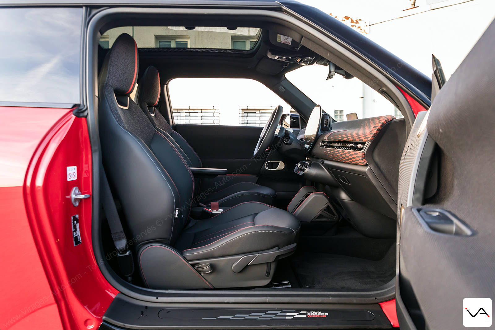 L’ambiance générale respire la qualité, avec des assemblages sérieux et une présentation soignée, même si la présence encore marquée de plastiques durs rappelle que l’on reste dans le segment des citadines premium. Le tissu qui habille la planche de bord, notamment côté passager avec son motif damier, est visuellement très réussi et renforce l’identité JCW. En revanche, son aspect un peu rêche se fait davantage sentir sur les panneaux de porte, où l’appui du bras en été, en simple t-shirt, manque clairement de douceur.