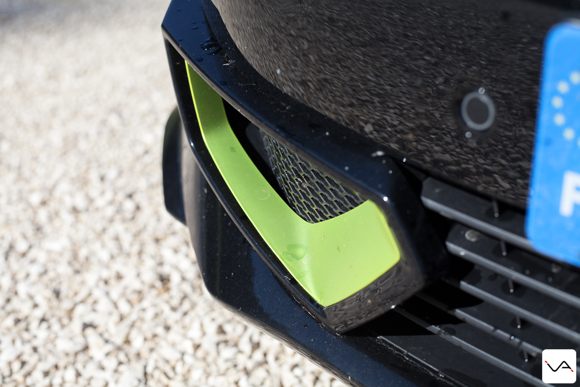 Si pour l’œil averti, la Peugeot 508 PSE sera reconnaissable au premier coup d’œil, force est de reconnaître qu’elle passera inaperçue dans la plupart des cas. Je me choque moi-même en écrivant ceci mais dans le climat autophobe actuel, je suis presque contente quand une voiture dite puissante est assez discrète. Nous ne sommes pas en face d’une voiture ostentatoire, visible, à la couleur criarde. Il y a bien les touches de « kryptonite » (est-ce vert, est-ce jaune, nous ne savons toujours pas), mais c’est bien là les seuls indices de couleurs avec les étriers avant. Il faut dire que notre teinte noire Perla Nera n’aide pas à faire ressortir la calandre ou les ailettes de bas de caisse.