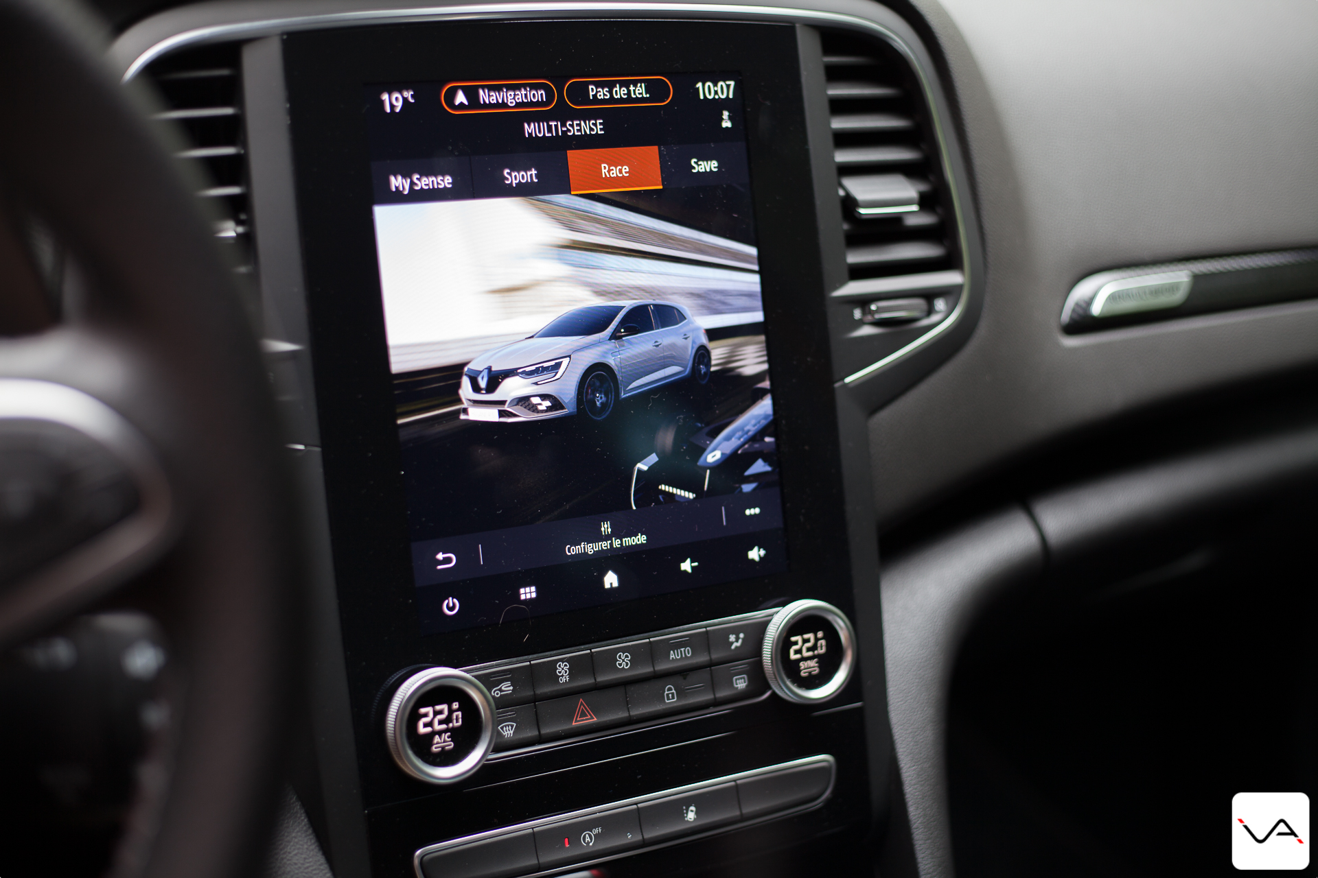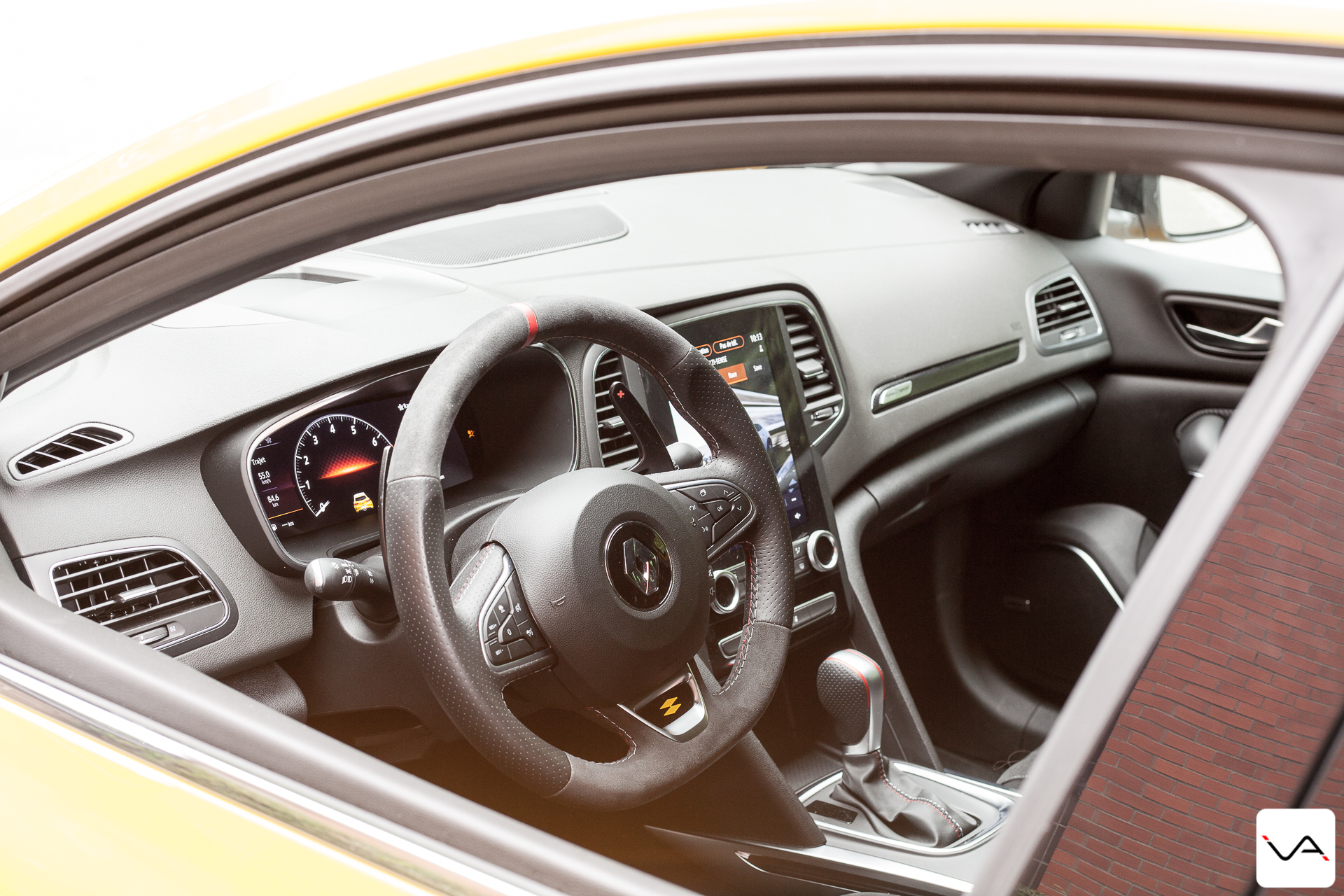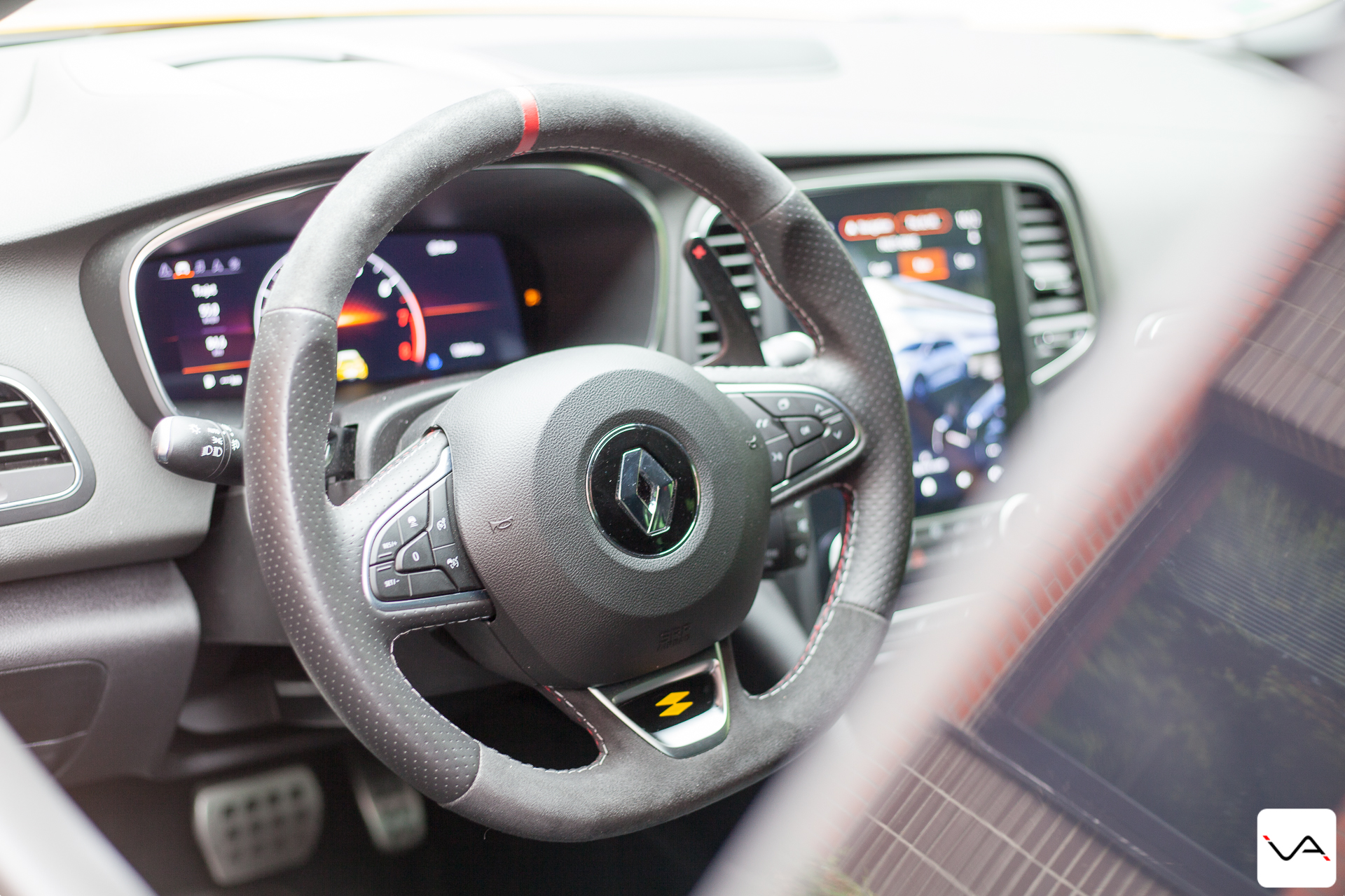 En s’installant à bord, on repère immédiatement les deux sièges Recaro du plus bel effet, et le volant en Alcantara. La jante épaisse transpire la conduite sportive et la promesse d’une direction aux petits oignons. Pour le reste, on retrouve une Mégane classique. Vous pouvez compter sur l’écran portrait, le R Link, les pièces d’accastillage en effet carbone, et l’ensemble des plastiques un peu durs (mais léger, ce qui importe plus dans notre cas). Notre version conserve sa banquette arrière, et jouit d’un coffre à la taille somme toute honorable.