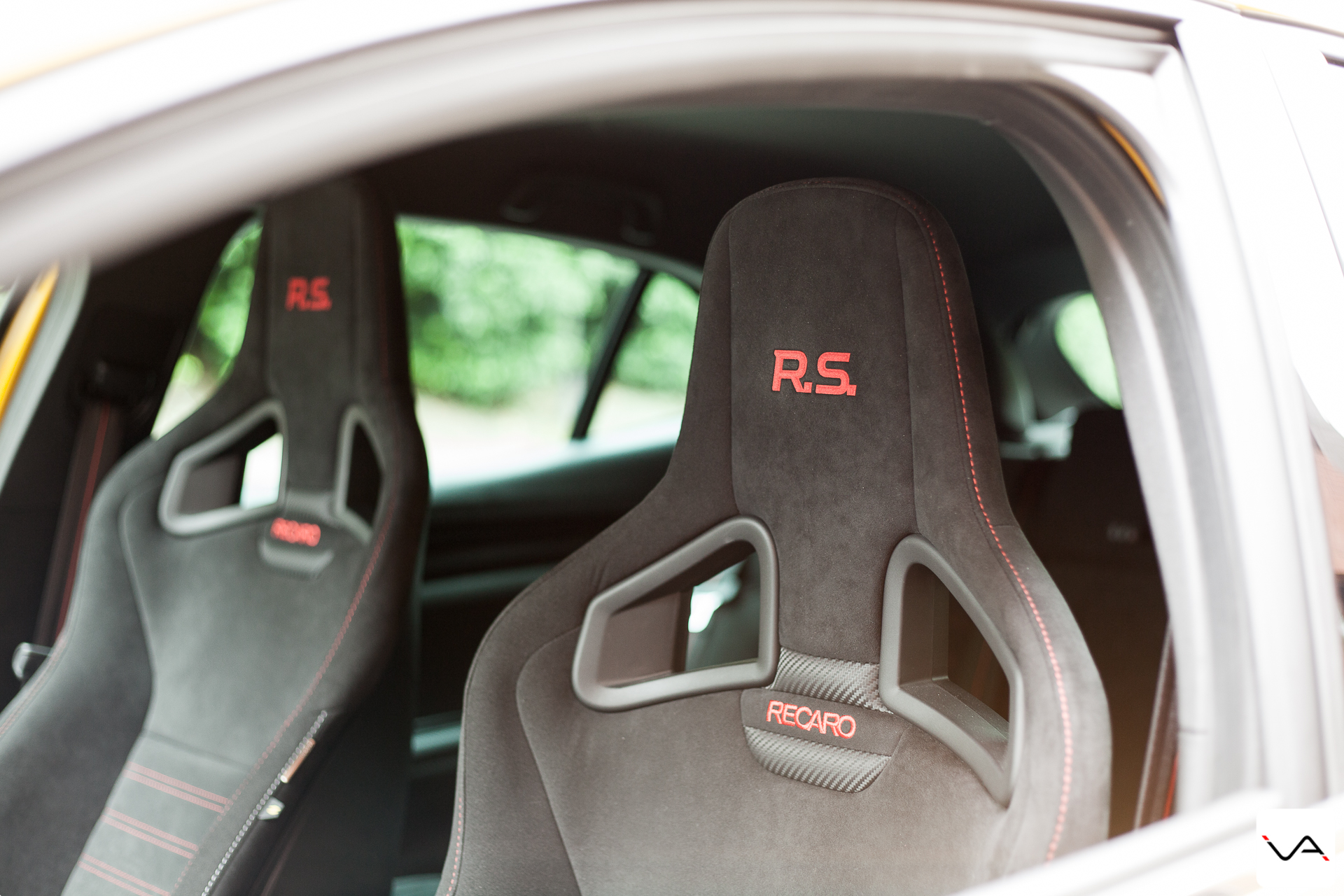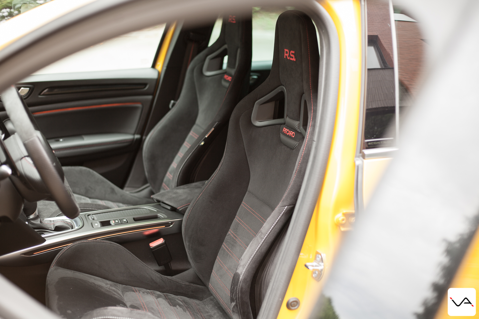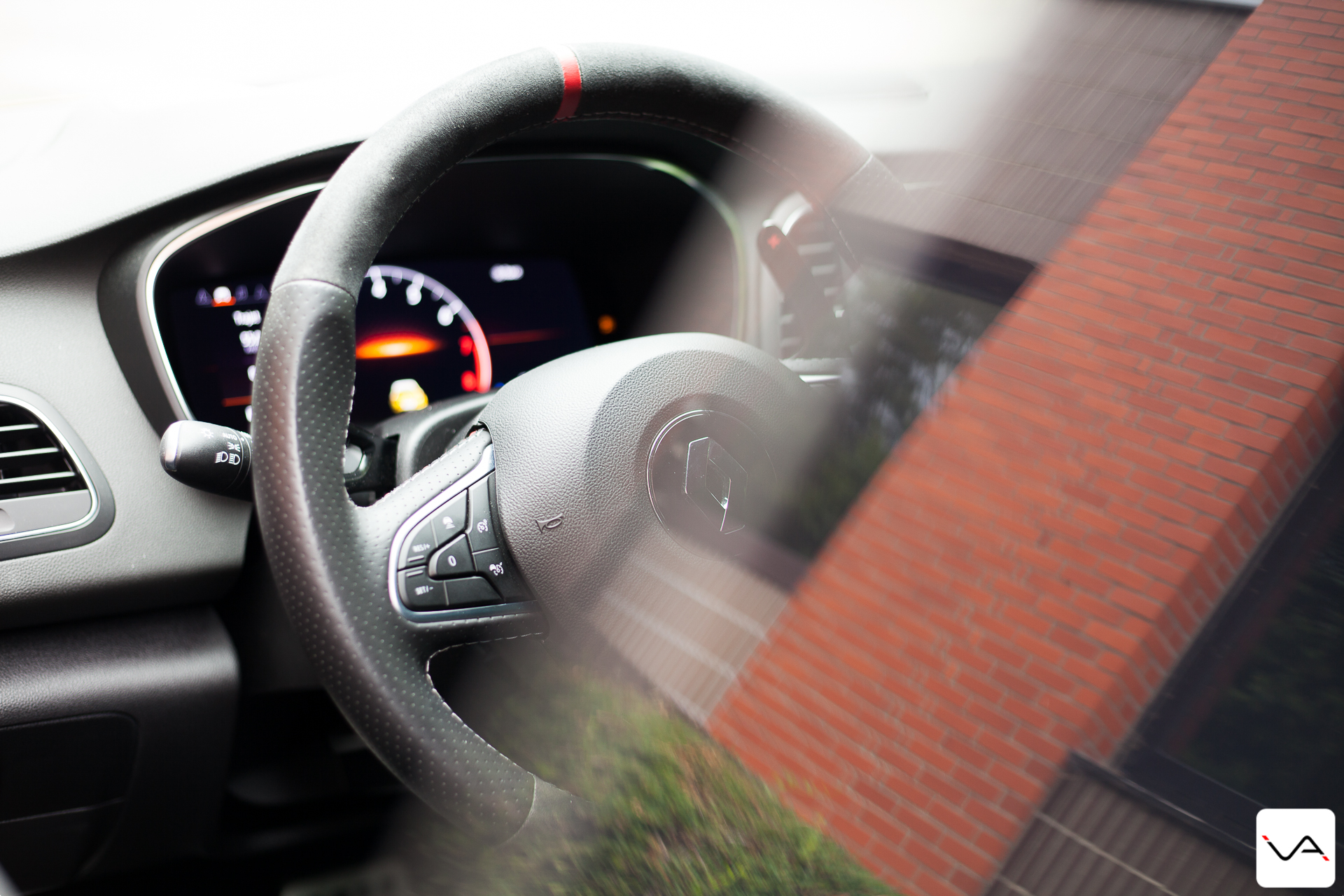 En s’installant à bord, on repère immédiatement les deux sièges Recaro du plus bel effet, et le volant en Alcantara. La jante épaisse transpire la conduite sportive et la promesse d’une direction aux petits oignons. Pour le reste, on retrouve une Mégane classique. Vous pouvez compter sur l’écran portrait, le R Link, les pièces d’accastillage en effet carbone, et l’ensemble des plastiques un peu durs (mais léger, ce qui importe plus dans notre cas). Notre version conserve sa banquette arrière, et jouit d’un coffre à la taille somme toute honorable.