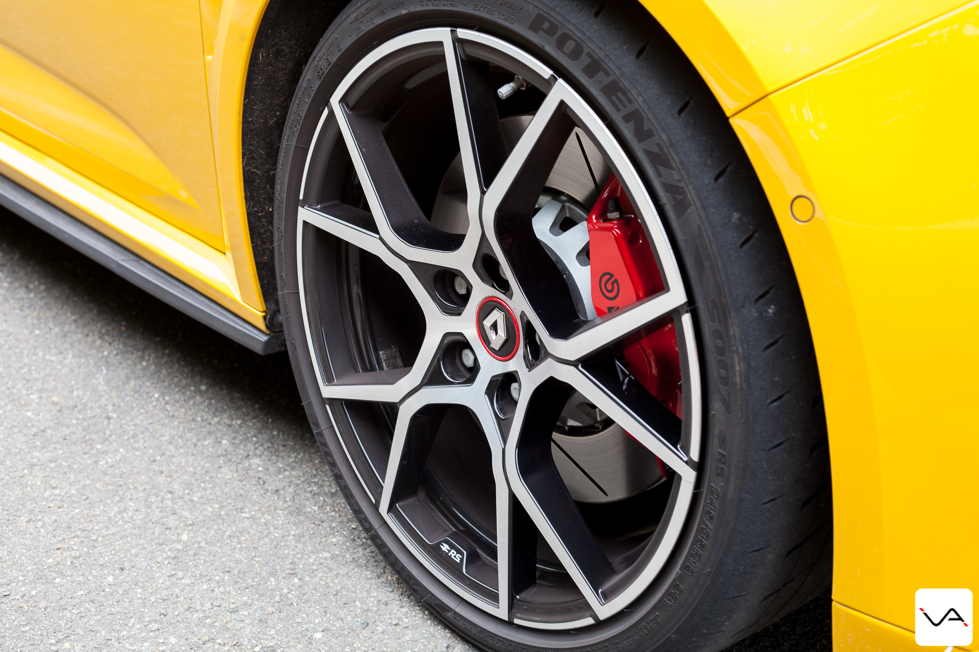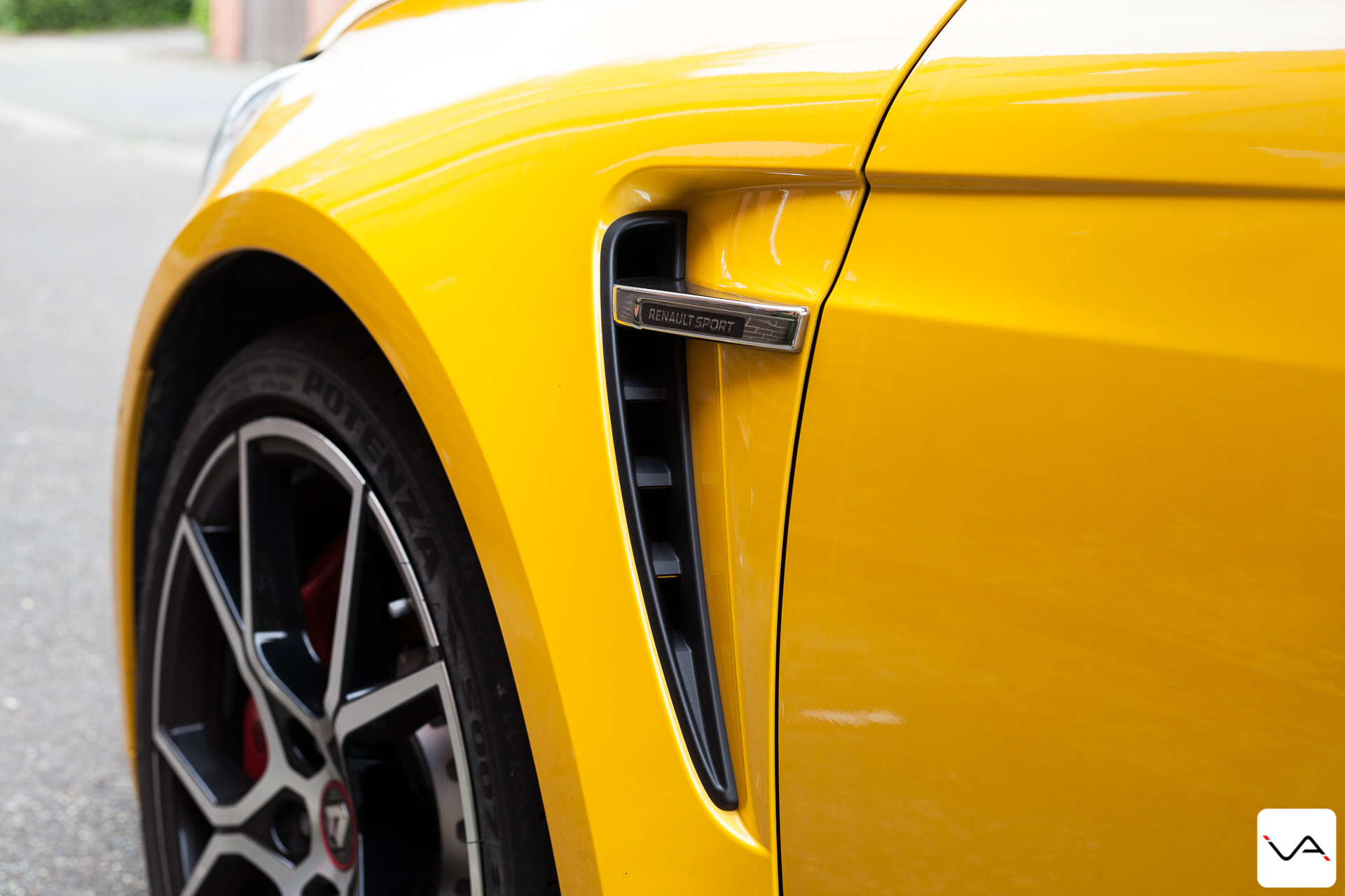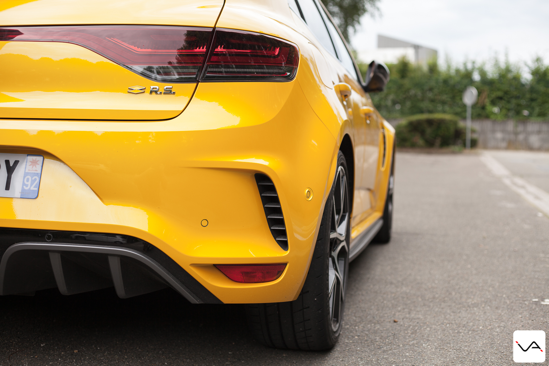 Sa teinte Jaune Sirius la rend très visible. J’aime beaucoup le fait que la couleur la vieillisse moins qu’un simple blanc. En effet, même si il s’agit d’une Mégane restylée, le style général n’assume pas moins de 5 ans déjà. Et si ce n’est pas vraiment vieux, on commence à connaître ce style inspiré des concepts Désir (2010), Initiale Paris et même TreZor (2016, en même temps que la Mégane). Les éléments Renault Sport caractéristiques musclent la Mégane sans la rendre vulgaire. On retrouve ainsi la belle lame avant dans la calandre, les trois optiques en forme de damier, les belles jantes cachant les gros freins, les écopes de sortie d’air sur les ailes avant. A l’arrière, on retrouve un diffuseur assez monstrueux , un bouclier massif flanqué de deux écopes, une sortie d’échappement centrale et un béquet plus prononcé.