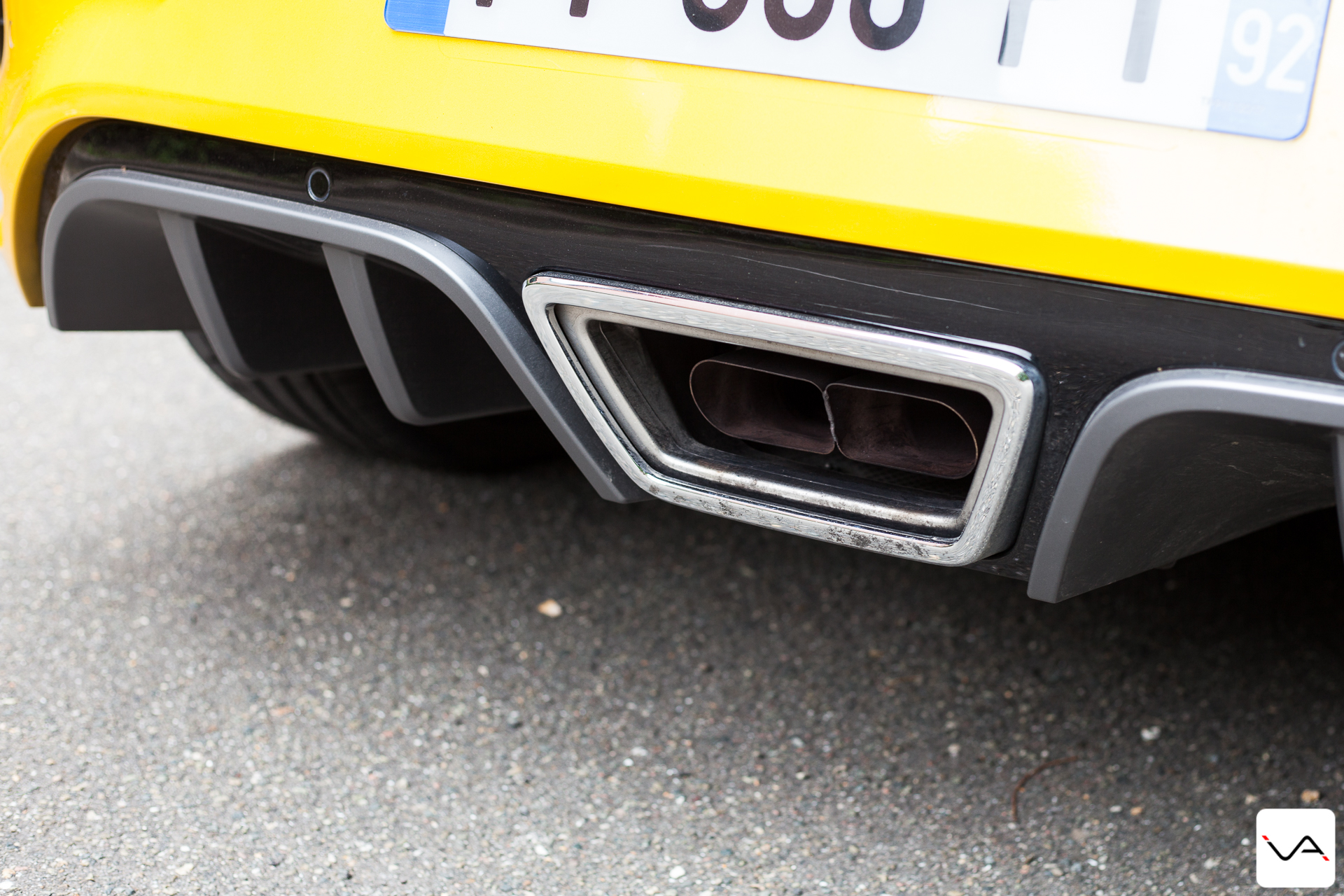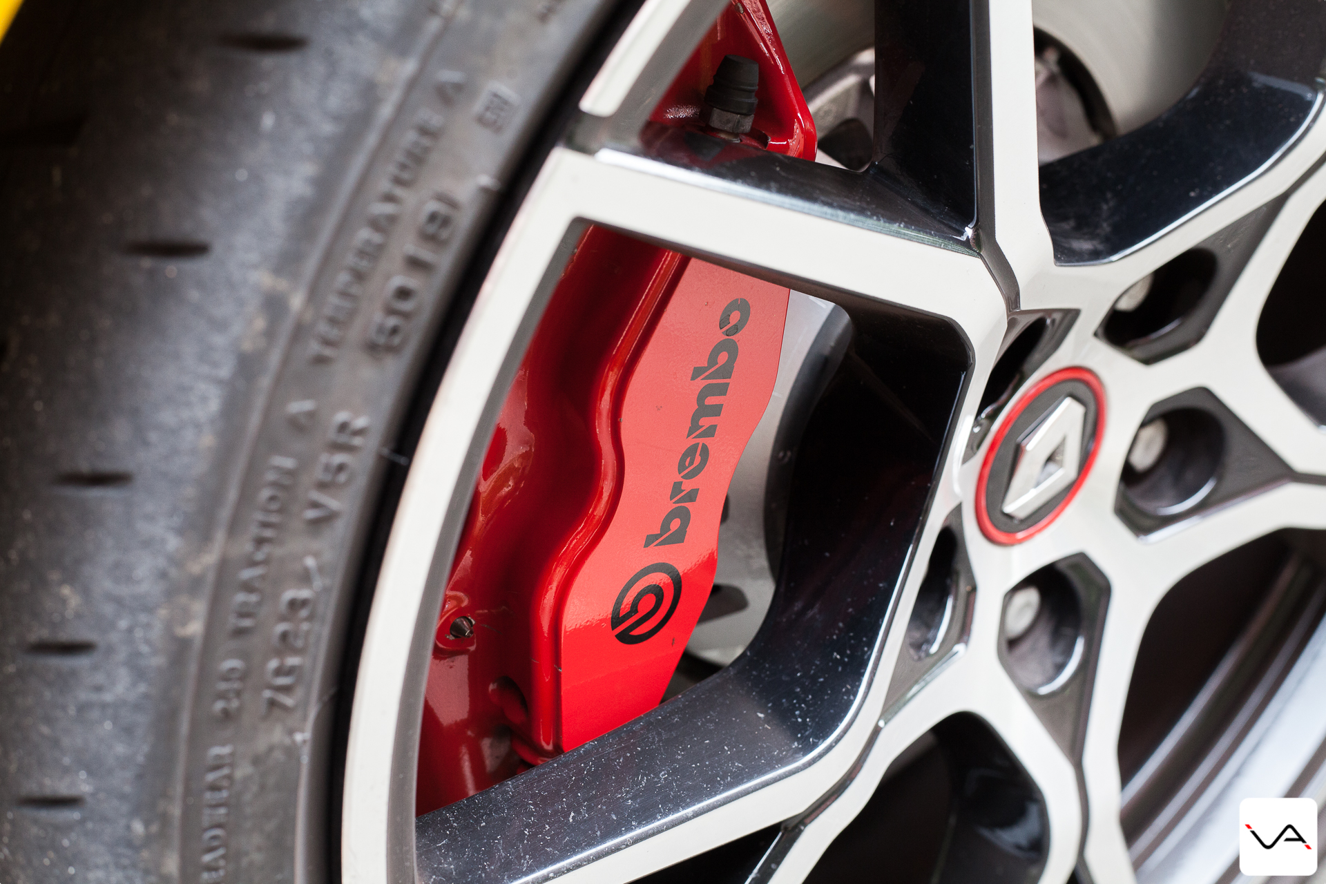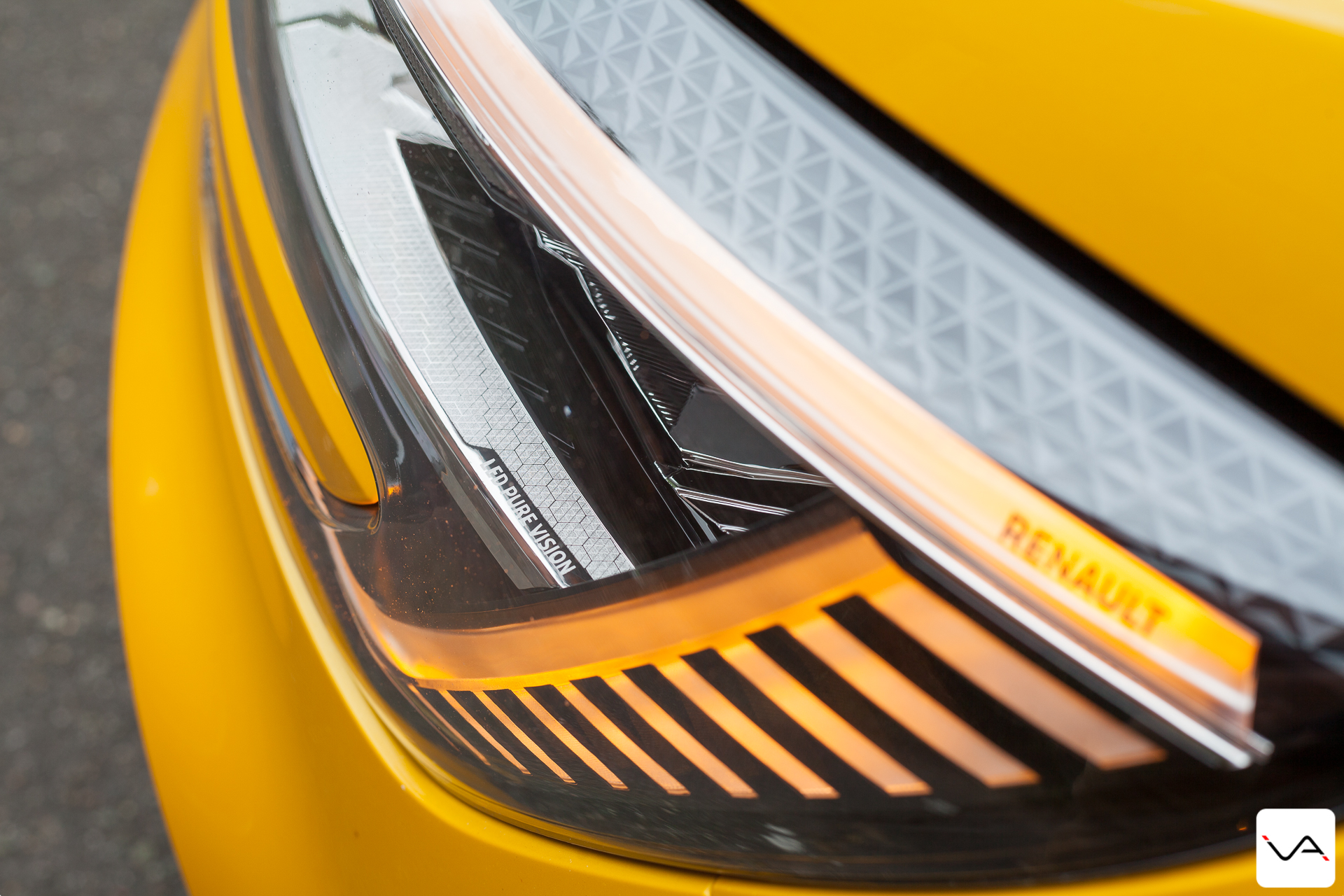 Sa teinte Jaune Sirius la rend très visible. J’aime beaucoup le fait que la couleur la vieillisse moins qu’un simple blanc. En effet, même si il s’agit d’une Mégane restylée, le style général n’assume pas moins de 5 ans déjà. Et si ce n’est pas vraiment vieux, on commence à connaître ce style inspiré des concepts Désir (2010), Initiale Paris et même TreZor (2016, en même temps que la Mégane). Les éléments Renault Sport caractéristiques musclent la Mégane sans la rendre vulgaire. On retrouve ainsi la belle lame avant dans la calandre, les trois optiques en forme de damier, les belles jantes cachant les gros freins, les écopes de sortie d’air sur les ailes avant. A l’arrière, on retrouve un diffuseur assez monstrueux , un bouclier massif flanqué de deux écopes, une sortie d’échappement centrale et un béquet plus prononcé.
