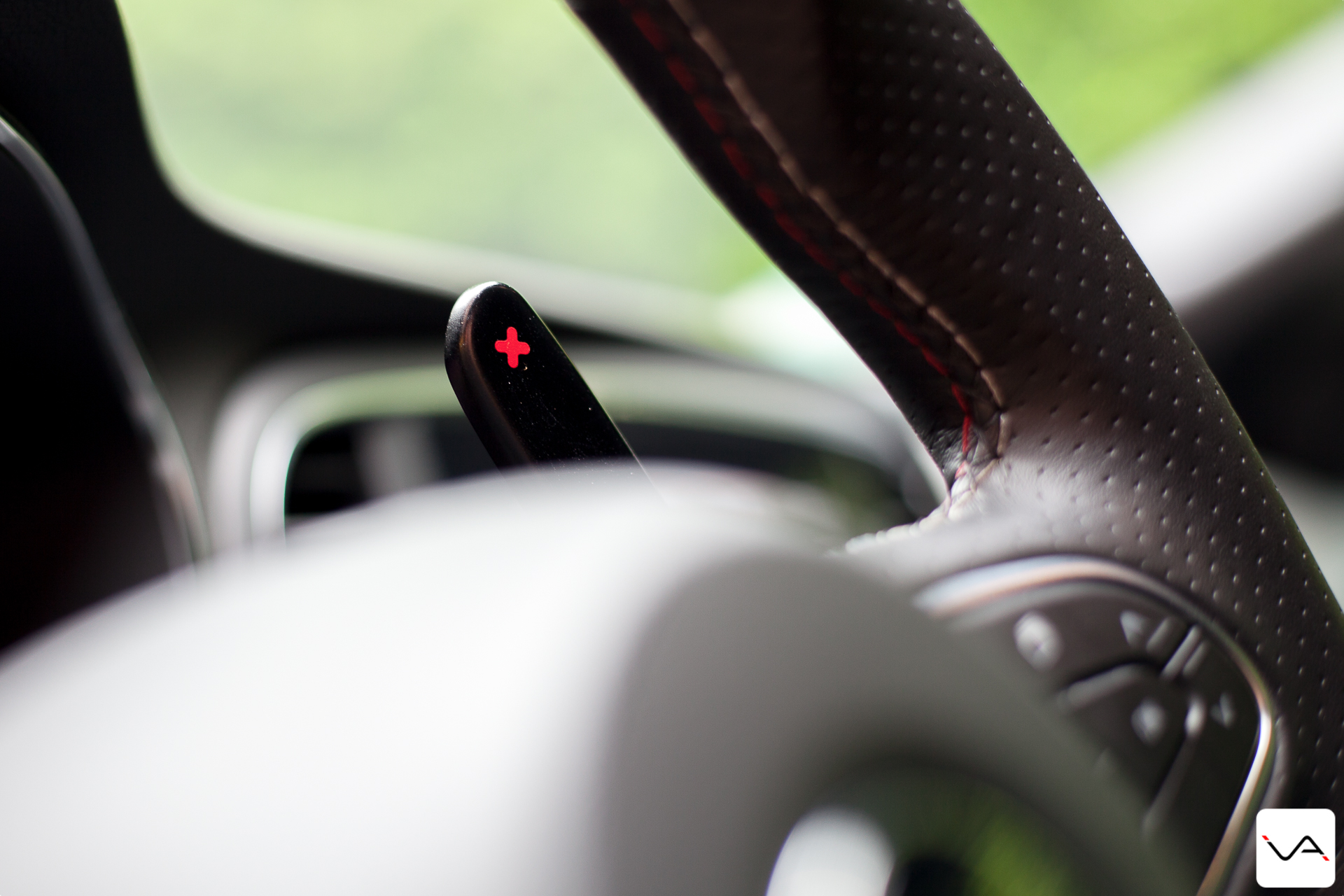 Lorsque les premières courbes arrivent, si les souvenirs de la Ferté Gaucher se rappellent à moi, je profite du grip procuré par la route et les pneus chauds pour enchaîner les changements d’appuis. Cela se fait tout en douceur et précision. Pas de changement brutal que ce soit sur le cap tenu ou les mouvements de caisse. La voiture profite d’une belle allonge et d’une direction digne d’un scalpel. En conduite sportive, la boîte de vitesses ne révèlent pas de défaut particulier. L’usage des palettes se montre agréable et addictif, profitant d’une belle réactivité.