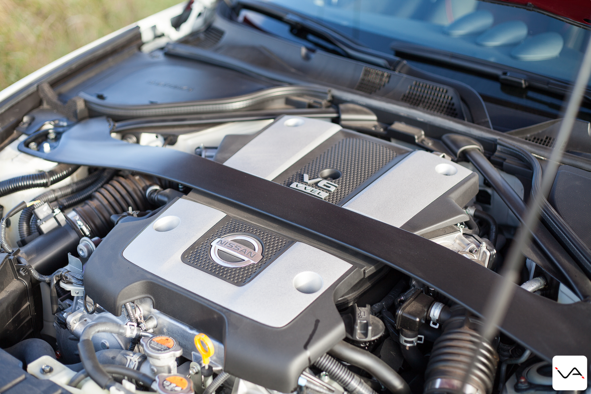 Le V6 est passé, en changeant de génération, de 3,5 à 3,7 litres. Il délivre désormais 328 ch à 7000 tr/min pour 363 Nm de couple à 5200 tr/min. Les chiffres ne sont pas énormes et improbables comme cela se fait de plus en plus aujourd’hui mais pour autant, le coupé japonais ne manque pas de ressources. La boîte de vitesses et légèrement plus courte mais la 3ème culmine toujours à 160 km/h. Comparé à la 350Z, la 370 semble pousser plus, sur toute la plage de couple. Après soyons honnêtes, c’est peut-être dû à la bande sonore moteur présente dans l’habitacle. Certes, la voiture en est à sa 12ème année de carrière, mais le son moteur retranscrit dans les haut-parleurs est juste insupportable, tant il sonne faux, et trop fort…