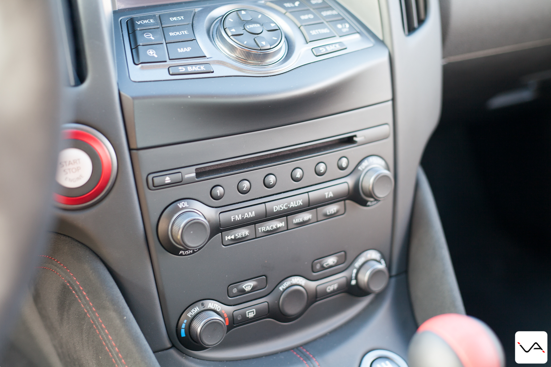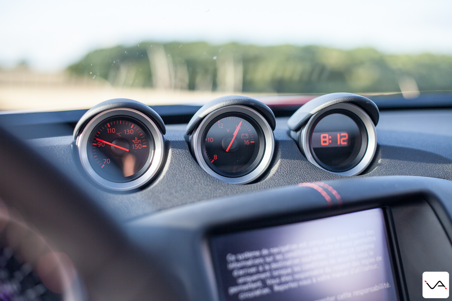 A l’intérieur, l’ambiance de la 350Z est entièrement reconduit. On retrouve les même informations au même endroit. Compteurs, GPS, jauges, commandes, tout est pareil. Il est cependant dommage de voir les jauges apparaître comme trois verrues, qui rappellent ce qui se faisait dans la 350Z sans pour autant avoir leur place dans la planche de bord. Il est également dommage de voir l’entourage de compteurs passer de l’aluminium à du plastique.