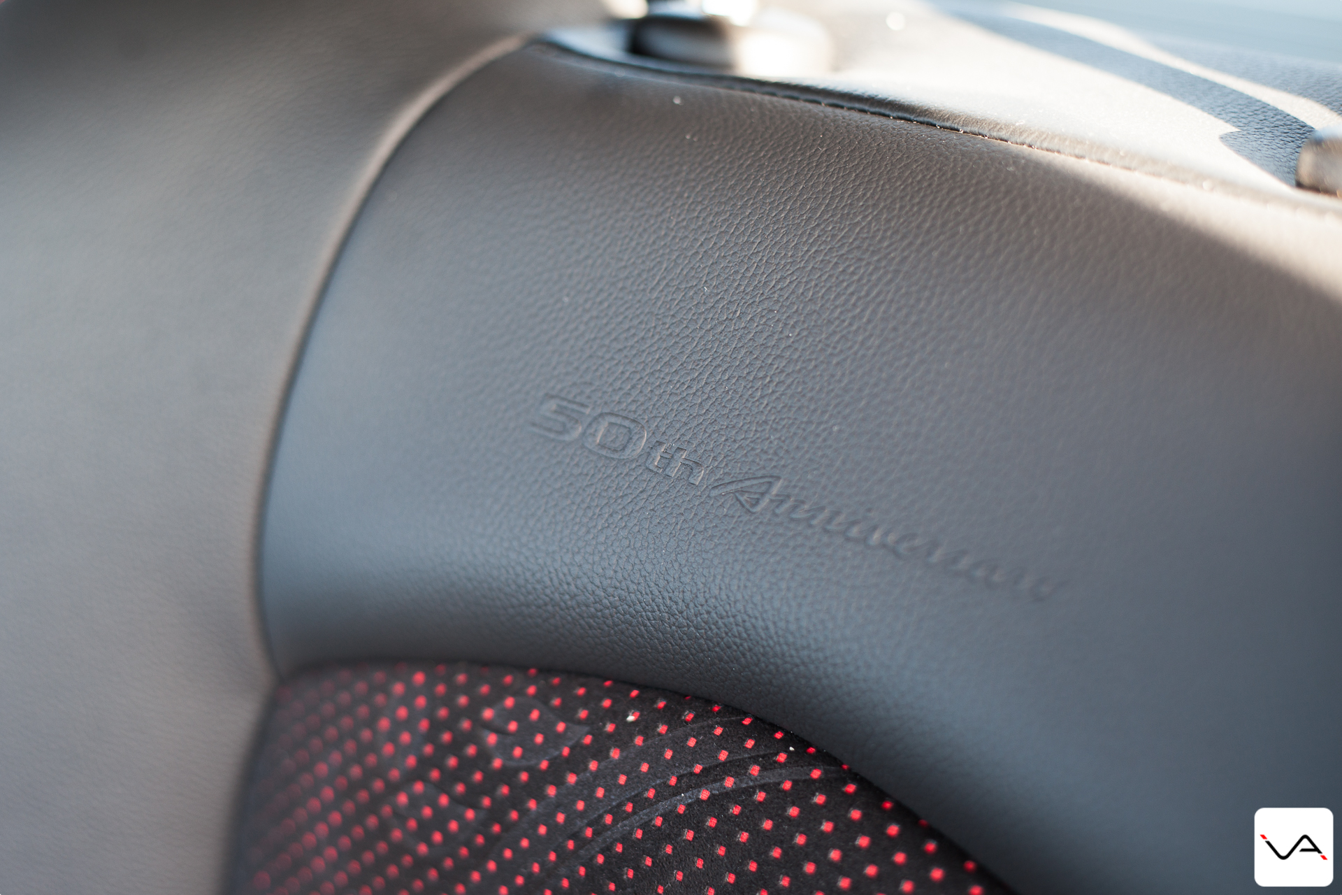 Les spécificités de notre édition 50th anniversaire tiennent, pour la totalité, de décorations esthétiques. Si le choix des couleurs est surprenant, la façon dont c’est réalisé l’est encore plus. Les éléments complets sont peints (capot, arches de toit et coffre). Mais pour les bandes et les inscriptions 50th Anniversary, il s’agit de simples stickers relativement bien (ou mal, à voir) posés. Cela manque réellement de finesse. Il est dommage de voir que l’édition limitée de la maison n’ait pas été mieux traitée, avec soit directement une peinture, soit des stickers beaucoup plus fins. Bref, c’est indigne d’un tel anniversaire…