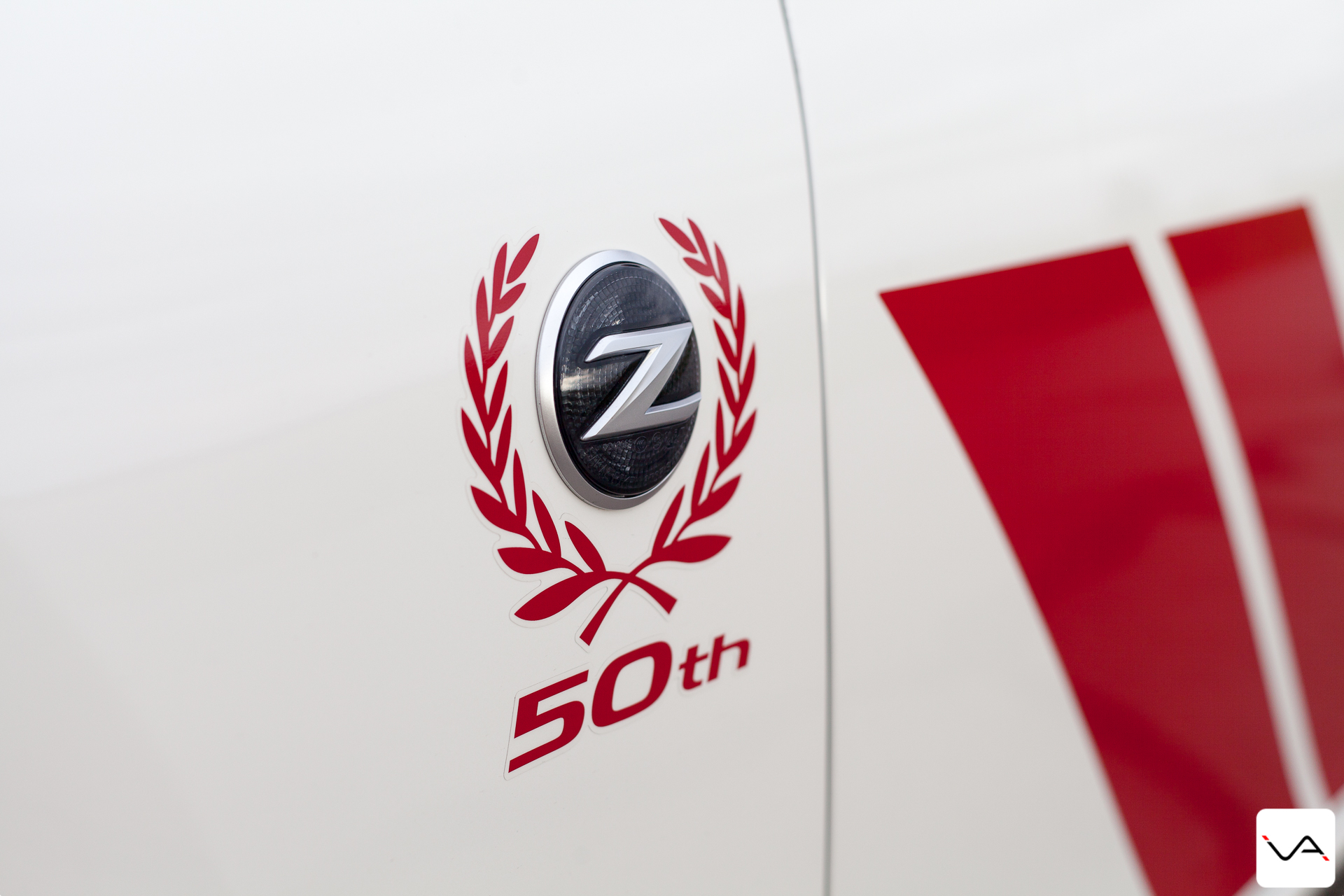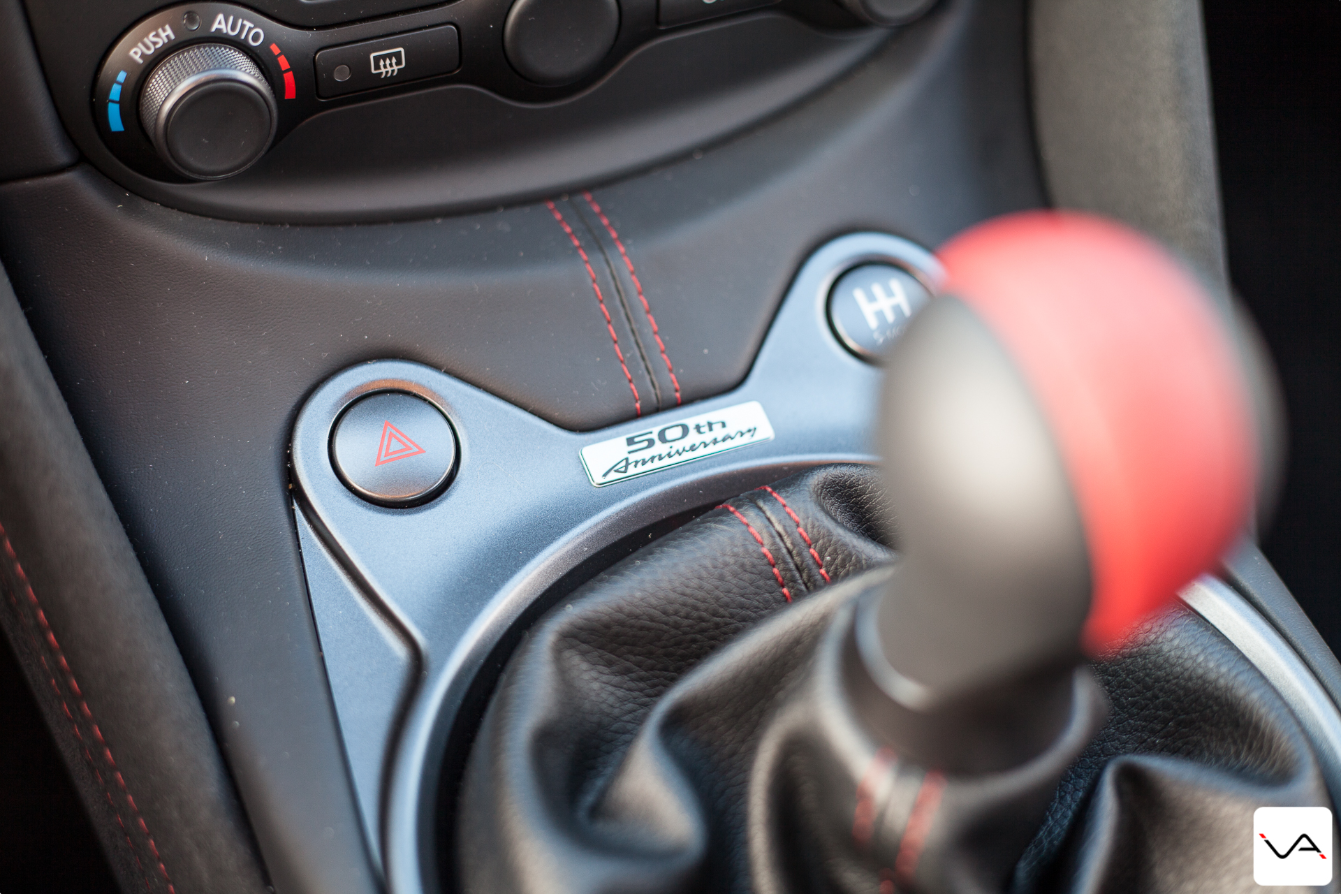 Par contre, on retrouve un très beau volant en Alcantara, très agréable au toucher et à la prise en main. Les baquets sont très agréables et semblent offrir un bon maintien. Ils sont gravés 50th Anniversary. On retrouve d’ailleurs l’inscription sur les seuils de portes et sur la console centrale. La même console qui, sur notre exemplaire d’essai, accueille une boîte de vitesses mécaniques à 6 rapports ! Quel plaisir de voir encore, en 2020, un bon vieux levier de vitesses ! Un petit bouton, à gauche de la planche de bord, permet de désactiver l’ESP. Comme pour la 350Z, il se désactive d’un seul appui, sans attendre indéfiniment comme cela se fait chez beaucoup de constructeurs.